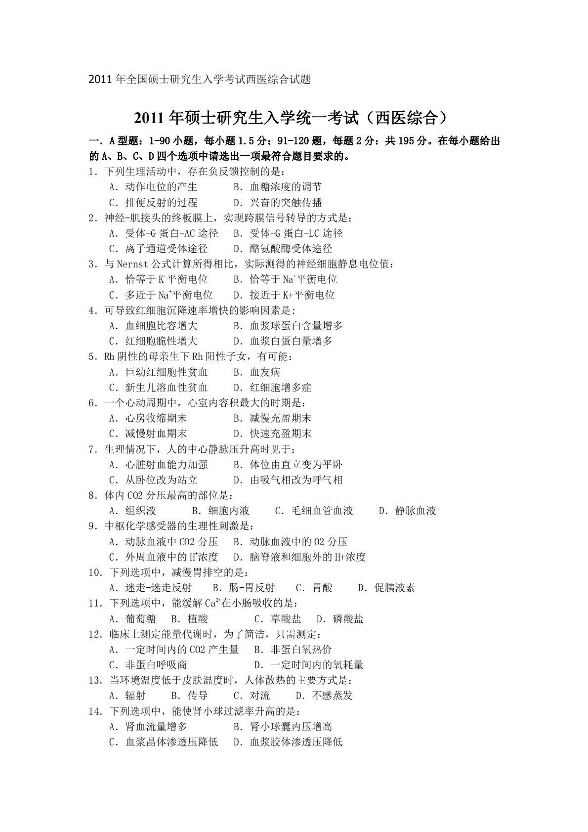 2011年全国硕士研究生入学考试西医综合试题2011年硕士研究生入学统一考试(西医综合)一.A型题:1-90小题,每小题1.5分;91-120题,每题2分:共195分。在每小题给出的A、B、C、D四个选项中请选出一项最符合题目要求的。1.下列生理活动中,存在负反馈控制的是:A.动作电位的产生B.血糖浓度的调节C.排便反射的过程D.兴奋的突触传播2.神经-肌接头的终板膜上,实现跨膜信号转导的方式是:A.受体-G蛋白-AC途径B.受体-G蛋白-LC途径C.离子通道受体途径D.酪氨酸酶受体途径3.与Nernst公式计算所得相比,实际测得的神经细胞静息电位值:A.恰等于K+平衡电位B.恰等于Na+平衡...