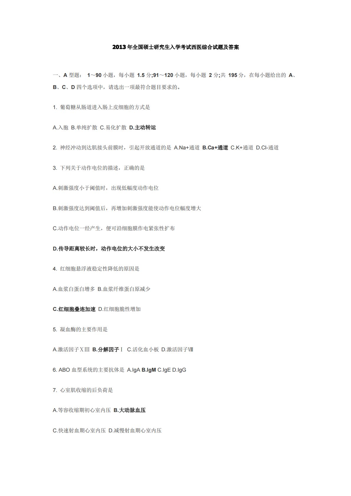 2013年全国硕士研究生入学考试西医综合试题及答案一、A型题:1~90小题,每小题1.5分;91~120小题,每小题2分;共195分,在每小题给出的A、B、C、D四个选项中,请选出一项最符合题目要求的。1.葡萄糖从肠道进入肠上皮细胞的方式是A.入胞B.单纯扩散C.易化扩散D.主动转运2.神经冲动到达肌接头前膜时,引起开放通道的是A.Na+通道B.Ca+通道C.K+通道D.Cl-通道3.下列关于动作电位的描述,正确的是A.刺激强度小于阈值时,出现低幅度动作电位B.刺激强度达到阈值后,再增加刺激强度能使动作电位幅度增大C.动作电位一经产生,便可沿细胞膜作电紧张性扩布D.传导距离较长时,动作电位的大...