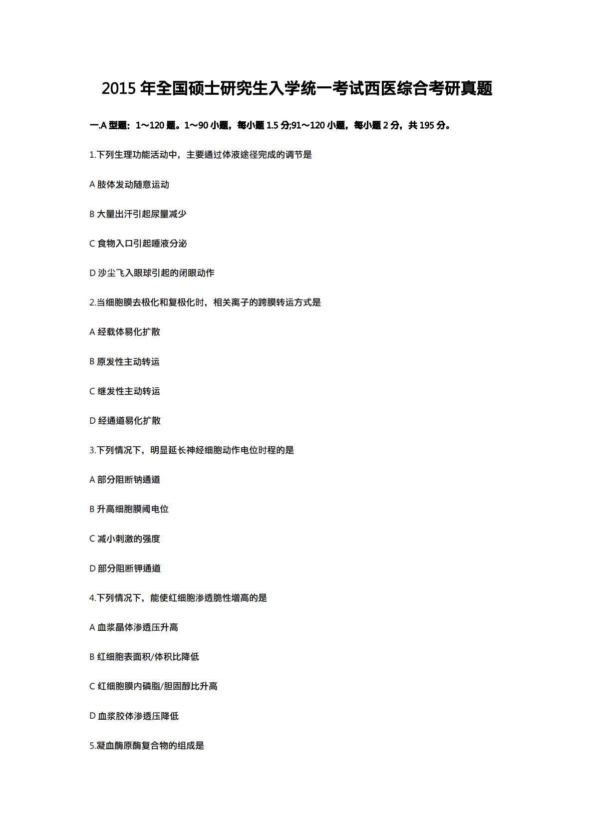 2015年全国硕士研究生入学统一考试西医综合考研真题一.A型题:1~120题。1~90小题,每小题1.5分;91~120小题,每小题2分,共195分。1.下列生理功能活动中,主要通过体液途径完成的调节是A肢体发动随意运动B大量出汗引起尿量减少C食物入口引起唾液分泌D沙尘飞入眼球引起的闭眼动作2.当细胞膜去极化和复极化时,相关离子的跨膜转运方式是A经载体易化扩散B原发性主动转运C继发性主动转运D经通道易化扩散3.下列情况下,明显延长神经细胞动作电位时程的是A部分阻断钠通道B升高细胞膜阈电位C减小刺激的强度D部分阻断钾通道4.下列情况下,能使红细胞渗透脆性增高的是A血浆晶体渗透压升高B红细胞表面积...