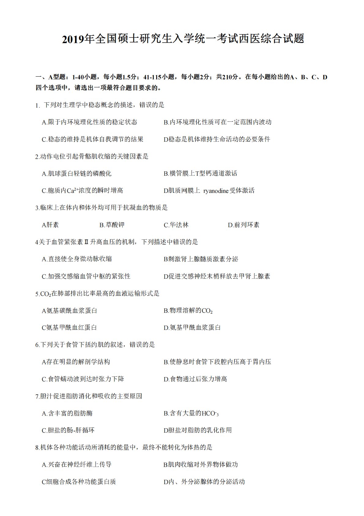 2019年全国硕士研究生入学统一考试西医综合试题一、A型题:1-40小题,每小题1.5分;41-115小题,每小题2分;共210分。在每小题给出的A、B、C,D四个选项中,请选出一项最符合题目要求的。1.下列对生理学中稳态概念的损述,错误的是A限千内环境理化性质的稳定状态C稳态的维持是机体自我调节的结果2动作电位引起骨骼肌收缩的关键因素是A肌球蛋臼轻链的磷酸化C胞质内Ca2+浓度的瞬时增高B内环境理化性质可在一定范围内波动D稳态是机体维持生命活动的必要条件B横管膜上T型钙通道激话D肌质网膜上ryanodine受体激活3临床上在体内和体外均可用千抗凝血的物质是A肝素B草酸钾C华法林D前列环素4关...