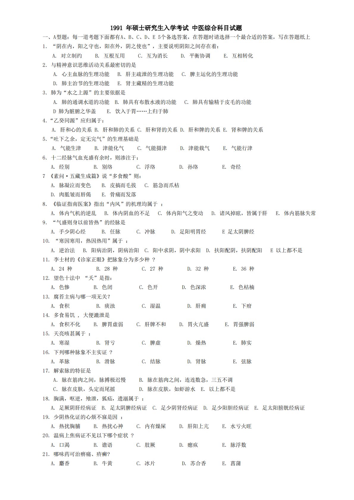 1991年硕士研究生入学考试中医综合科目试题一、A型题:每一道考题下面都有A、B、C、D、E5个备选答案,在答题时请选择一个最合适的答案,写在答题纸上1.“阴在内,阳之守也,阳在外,阴之使也”,主要说明阴阳之间存在着:A.对立制约B.互根互用C.互为消长D.平衡协调E.互相转化2.与精神意识思维活动关系最密切的是A.心主血脉的生理功能B.肝主疏泄的生理功能C.脾主运化的生理功能D.肺主治节的生理功能E.肾主藏精的生理功能3.肺为“水之上源”的主要依据是A.肺的通调水道的功能B.肺具有布散水液的功能C.肺具有输精于皮毛的功能D肺为脏腑之华盖E.饮入于胃……上归于肺4.“乙癸同源”应归属于:A.肝...