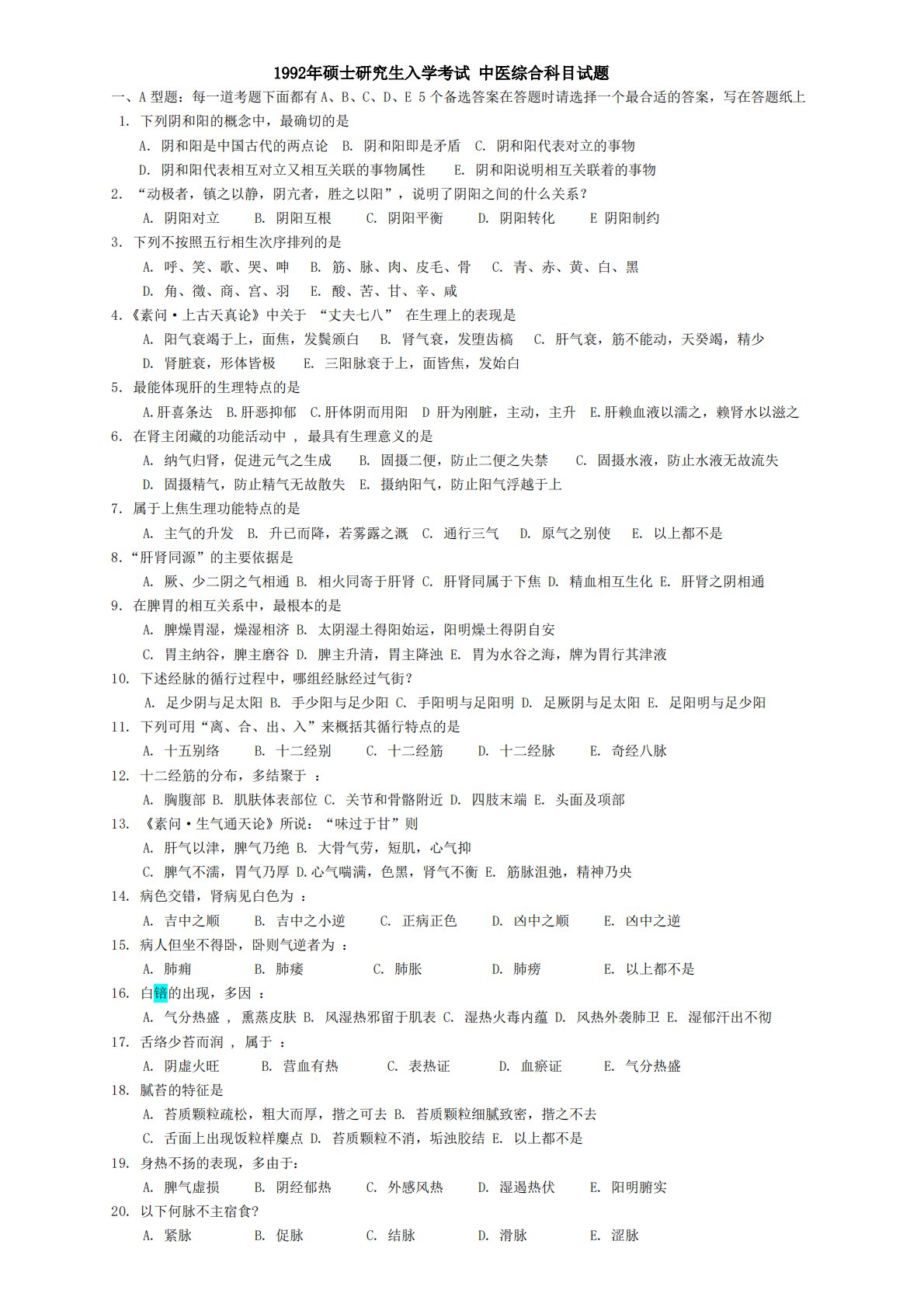 1992年硕士研究生入学考试中医综合科目试题一、A型题:每一道考题下面都有A、B、C、D、E5个备选答案在答题时请选择一个最合适的答案,写在答题纸上1.下列阴和阳的概念中,最确切的是A.阴和阳是中国古代的两点论B.阴和阳即是矛盾C.阴和阳代表对立的事物D.阴和阳代表相互对立又相互关联的事物属性E.阴和阳说明相互关联着的事物2.“动极者,镇之以静,阴亢者,胜之以阳”,说明了阴阳之间的什么关系?A.阴阳对立B.阴阳互根C.阴阳平衡D.阴阳转化E阴阳制约3.下列不按照五行相生次序排列的是A.呼、笑、歌、哭、呻B.筋、脉、肉、皮毛、骨C.青、赤、黄、白、黑D.角、徵、商、宫、羽E.酸、苦、甘、辛、咸4...