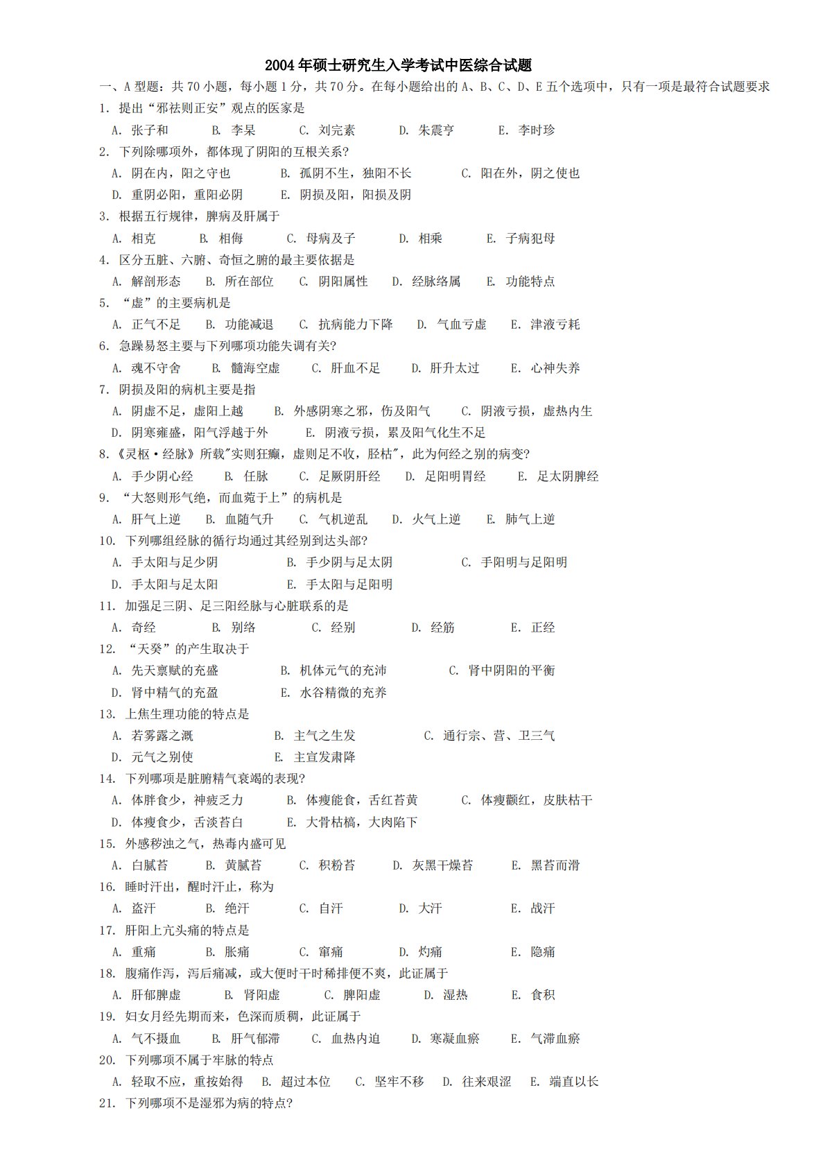 2004年硕士研究生入学考试中医综合试题一、A型题:共70小题,每小题1分,共70分。在每小题给出的A、B、C、D、E五个选项中,只有一项是最符合试题要求1.提出“邪祛则正安”观点的医家是A.张子和B.李杲C.刘完素D.朱震亨E.李时珍2.下列除哪项外,都体现了阴阳的互根关系?A.阴在内,阳之守也B.孤阴不生,独阳不长C.阳在外,阴之使也D.重阴必阳,重阳必阴E.阴损及阳,阳损及阴3.根据五行规律,脾病及肝属于A.相克B.相侮C.母病及子D.相乘E.子病犯母4.区分五脏、六腑、奇恒之腑的最主要依据是A.解剖形态B.所在部位C.阴阳属性D.经脉络属E.功能特点5.“虚”的主要病机是A.正气不足B...