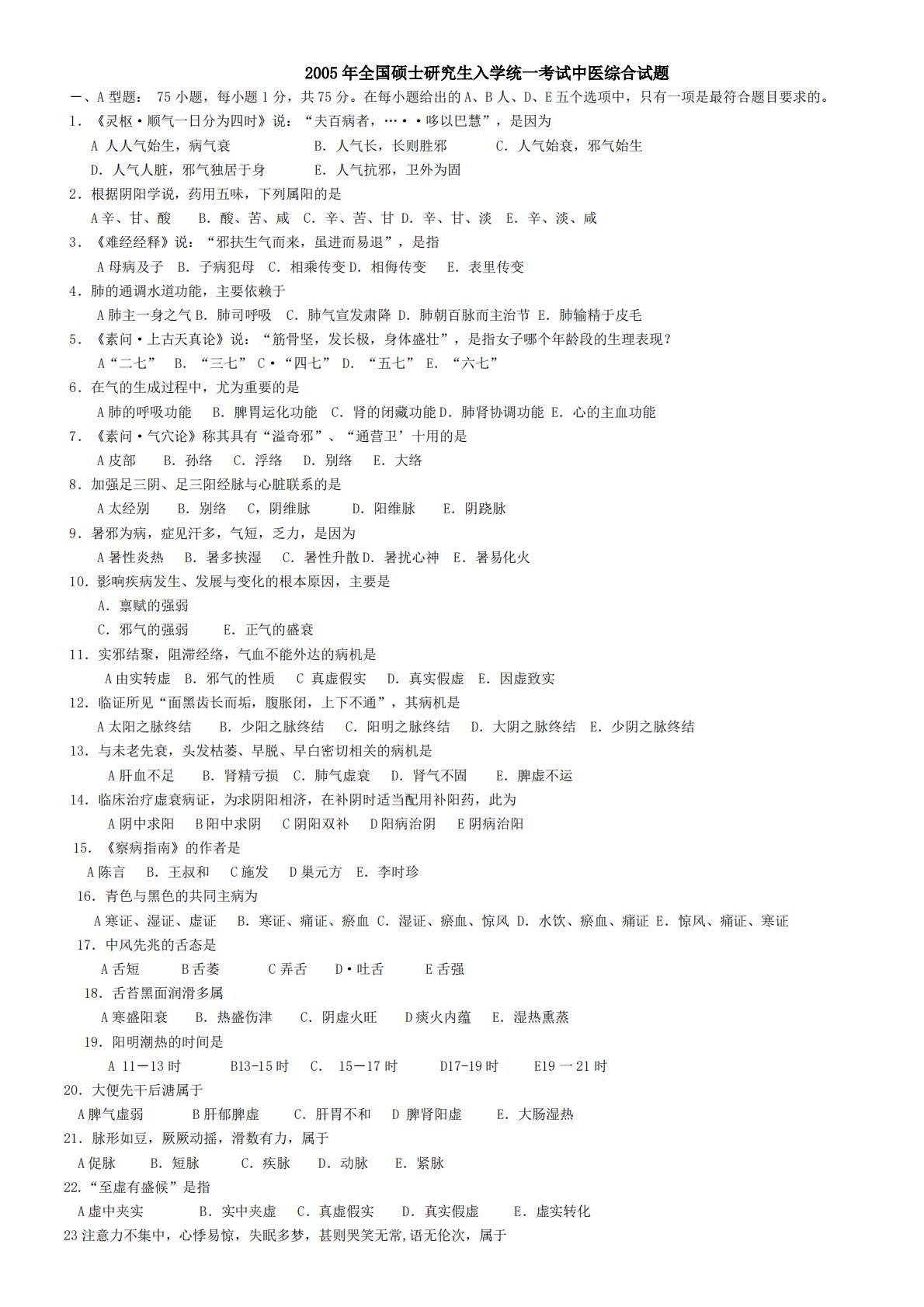 2005年全国硕士研究生入学统一考试中医综合试题-、A型题:75小题,每小题1分,共75分。在每小题给出的A、B人、D、E五个选项中,只有一项是最符合题目要求的。l.《灵枢·顺气一日分为四时》说:“夫百病者,…··哆以巴慧”,是因为A人人气始生,病气衰B.人气长,长则胜邪C.人气始衰,邪气始生D.人气人脏,邪气独居于身E.人气抗邪,卫外为固2.根据阴阳学说,药用五味,下列属阳的是A辛、甘、酸B.酸、苦、咸C.辛、苦、甘D.辛、甘、淡E.辛、淡、咸3.《难经经释》说:“邪扶生气而来,虽进而易退”,是指A母病及子B.子病犯母C.相乘传变D.相侮传变E.表里传变4.肺的通调水道功能,主要依赖于A肺主...