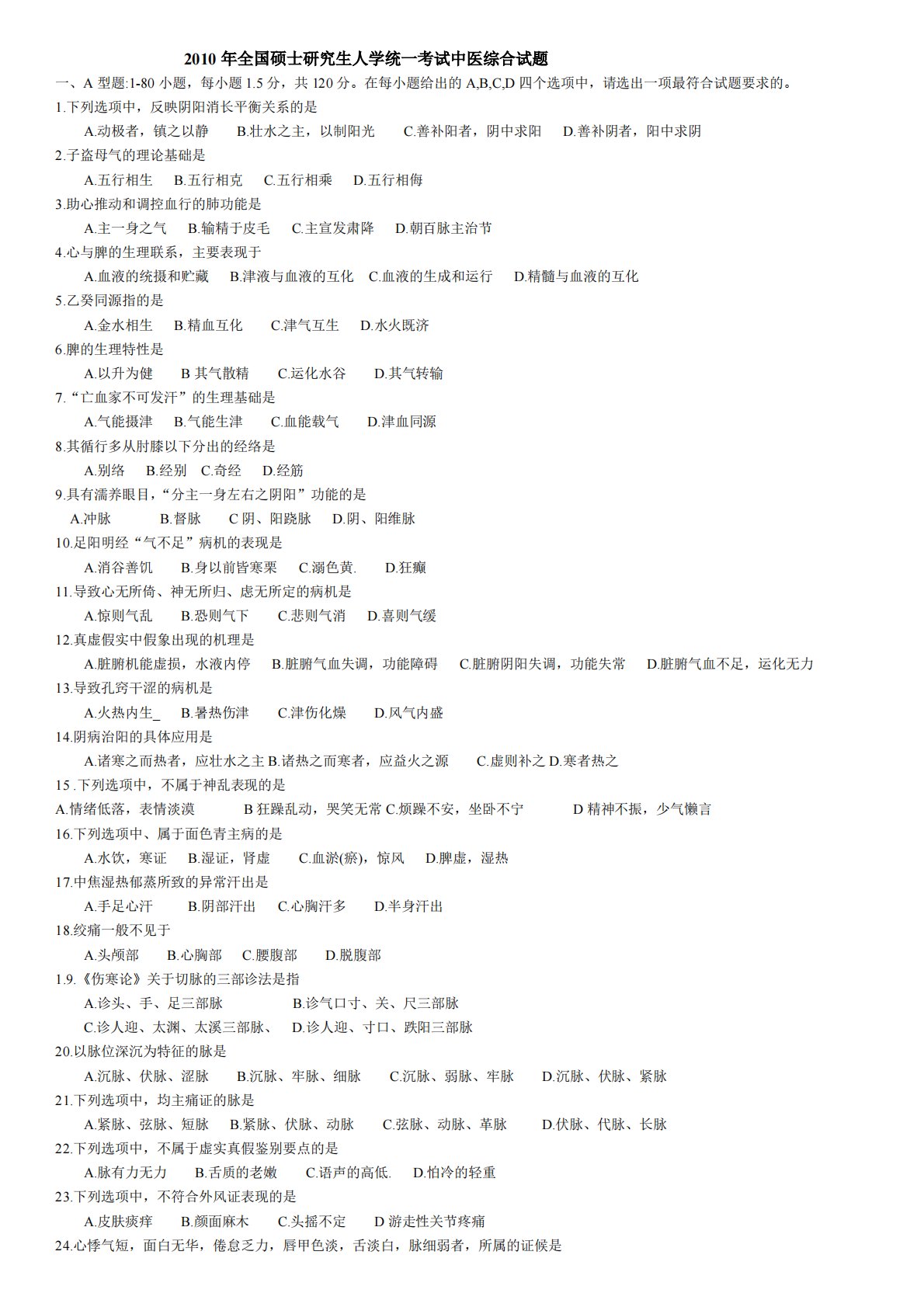 2010年全国硕士研究生人学统一考试中医综合试题一、A型题:1-80小题,每小题1.5分,共120分。在每小题给出的A,B,C,D四个选项中,请选出一项最符合试题要求的。1.下列选项中,反映阴阳消长平衡关系的是A.动极者,镇之以静B.壮水之主,以制阳光C.善补阳者,阴中求阳D.善补阴者,阳中求阴2.子盗母气的理论基础是A.五行相生B.五行相克C.五行相乘D.五行相侮3.助心推动和调控血行的肺功能是A.主一身之气B.输精于皮毛C.主宣发肃降D.朝百脉主治节4.心与脾的生理联系,主要表现于A.血液的统摄和贮藏B.津液与血液的互化C.血液的生成和运行D.精髓与血液的互化5.乙癸同源指的是A.金水相生...