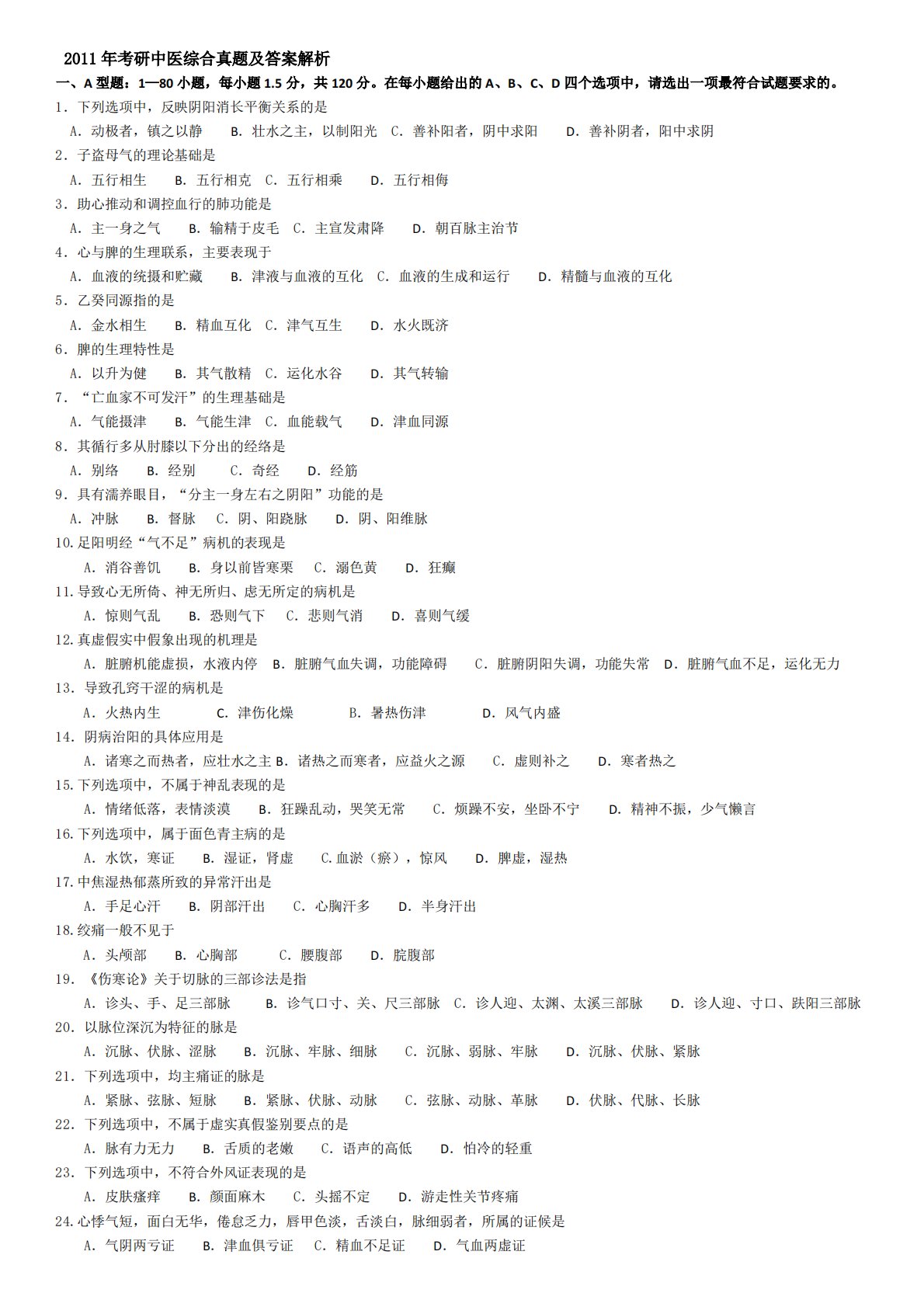 2011年考研中医综合真题及答案解析一、A型题:1—80小题,每小题1.5分,共120分。在每小题给出的A、B、C、D四个选项中,请选出一项最符合试题要求的。1.下列选项中,反映阴阳消长平衡关系的是A.动极者,镇之以静B.壮水之主,以制阳光C.善补阳者,阴中求阳D.善补阴者,阳中求阴2.子盗母气的理论基础是A.五行相生B.五行相克C.五行相乘D.五行相侮3.助心推动和调控血行的肺功能是A.主一身之气B.输精于皮毛C.主宣发肃降D.朝百脉主治节4.心与脾的生理联系,主要表现于A.血液的统摄和贮藏B.津液与血液的互化C.血液的生成和运行D.精髓与血液的互化5.乙癸同源指的是A.金水相生B.精血互化...
