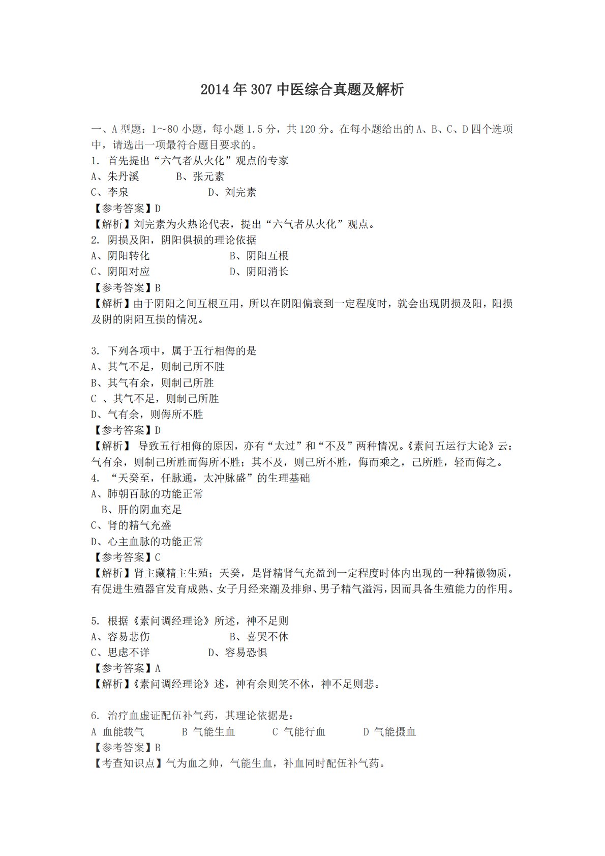 2014年307中医综合真题及解析一、A型题:1~80小题,每小题1.5分,共120分。在每小题给出的A、B、C、D四个选项中,请选出一项最符合题目要求的。1.首先提出“六气者从火化”观点的专家A、朱丹溪B、张元素C、李泉D、刘完素【参考答案】D【解析】刘完素为火热论代表,提出“六气者从火化”观点。2.阴损及阳,阴阳俱损的理论依据A、阴阳转化B、阴阳互根C、阴阳对应D、阴阳消长【参考答案】B【解析】由于阴阳之间互根互用,所以在阴阳偏衰到一定程度时,就会出现阴损及阳,阳损及阴的阴阳互损的情况。3.下列各项中,属于五行相侮的是A、其气不足,则制己所不胜B、其气有余,则制己所胜C、其气不足,则制己所...