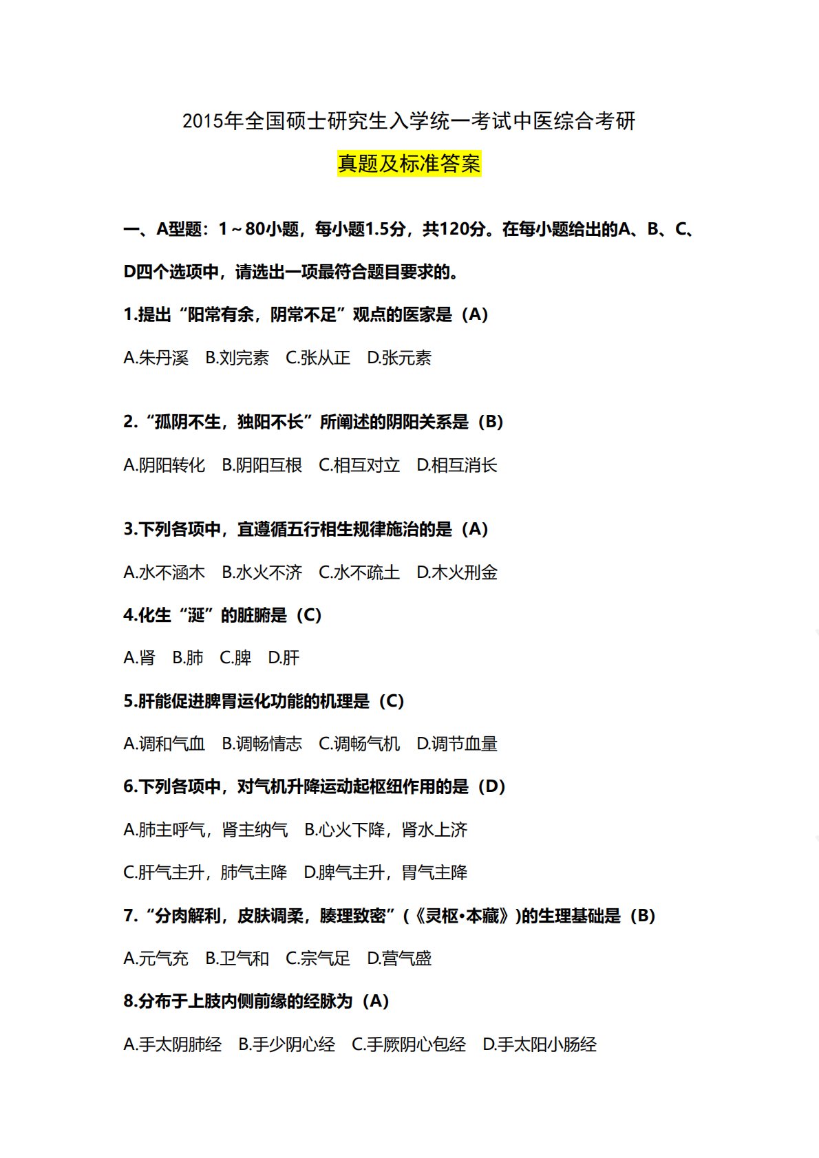 2015年全国硕士研究生入学统一考试中医综合考研真题及标准答案一、A型题:1~80小题,每小题1.5分,共120分。在每小题给出的A、B、C、D四个选项中,请选出一项最符合题目要求的。1.提出“阳常有余,阴常不足”观点的医家是(A)A.朱丹溪B.刘完素C.张从正D.张元素2.“孤阴不生,独阳不长”所阐述的阴阳关系是(B)A.阴阳转化B.阴阳互根C.相互对立D.相互消长3.下列各项中,宜遵循五行相生规律施治的是(A)A.水不涵木B.水火不济C.水不疏土D.木火刑金4.化生“涎”的脏腑是(C)A.肾B.肺C.脾D.肝5.肝能促进脾胃运化功能的机理是(C)A.调和气血B.调畅情志C.调畅气机D.调节...
