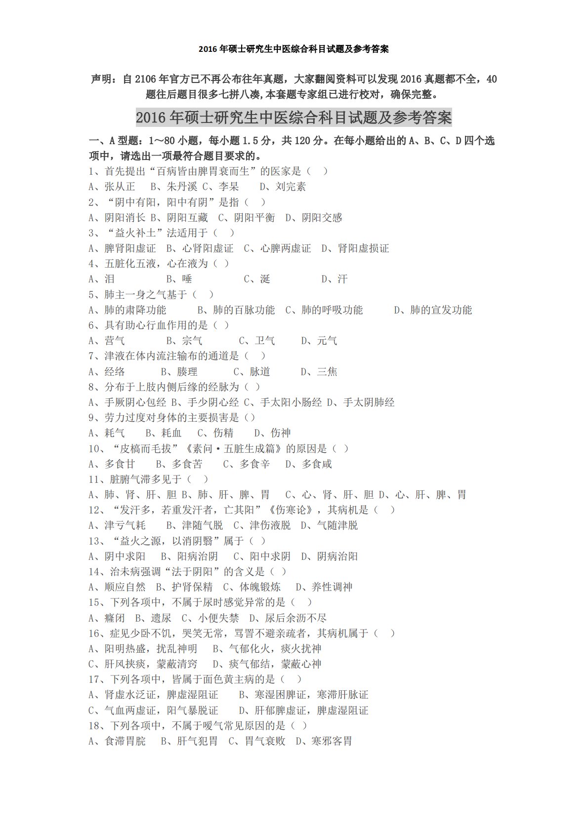 2016年硕士研究生中医综合科目试题及参考答案声明:自2106年官方已不再公布往年真题,大家翻阅资料可以发现2016真题都不全,40题往后题目很多七拼八凑,本套题专家组已进行校对,确保完整。2016年硕士研究生中医综合科目试题及参考答案一、A型题:1~80小题,每小题1.5分,共120分。在每小题给出的A、B、C、D四个选项中,请选出一项最符合题目要求的。1、首先提出“百病皆由脾胃衰而生”的医家是()A、张从正B、朱丹溪C、李杲D、刘完素2、“阴中有阳,阳中有阴”是指()A、阴阳消长B、阴阳互藏C、阴阳平衡D、阴阳交感3、“益火补土”法适用于()A、脾肾阳虚证B、心肾阳虚证C、心脾两虚证D、肾...