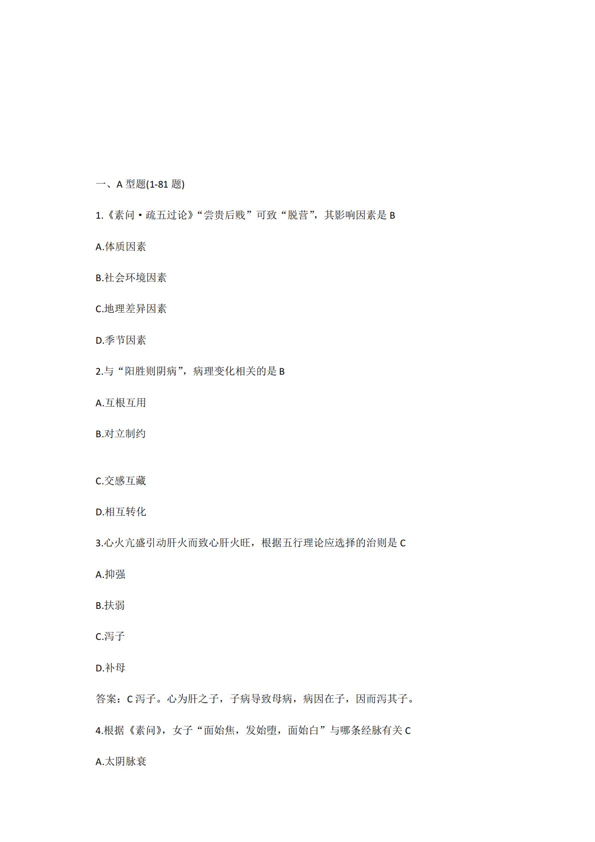 一、A型题(1-81题)1.《素问·疏五过论》“尝贵后贱”可致“脱营”,其影响因素是BA.体质因素B.社会环境因素C.地理差异因素D.季节因素2.与“阳胜则阴病”,病理变化相关的是BA.互根互用B.对立制约C.交感互藏D.相互转化3.心火亢盛引动肝火而致心肝火旺,根据五行理论应选择的治则是CA.抑强B.扶弱C.泻子D.补母答案:C泻子。心为肝之子,子病导致母病,病因在子,因而泻其子。4.根据《素问》,女子“面始焦,发始堕,面始白”与哪条经脉有关CA.太阴脉衰新东方在线考研m-kaoyan.koolearn.com新东方在线考研m-kaoyan.koolearn.com新东方在线考研m-kaoy...