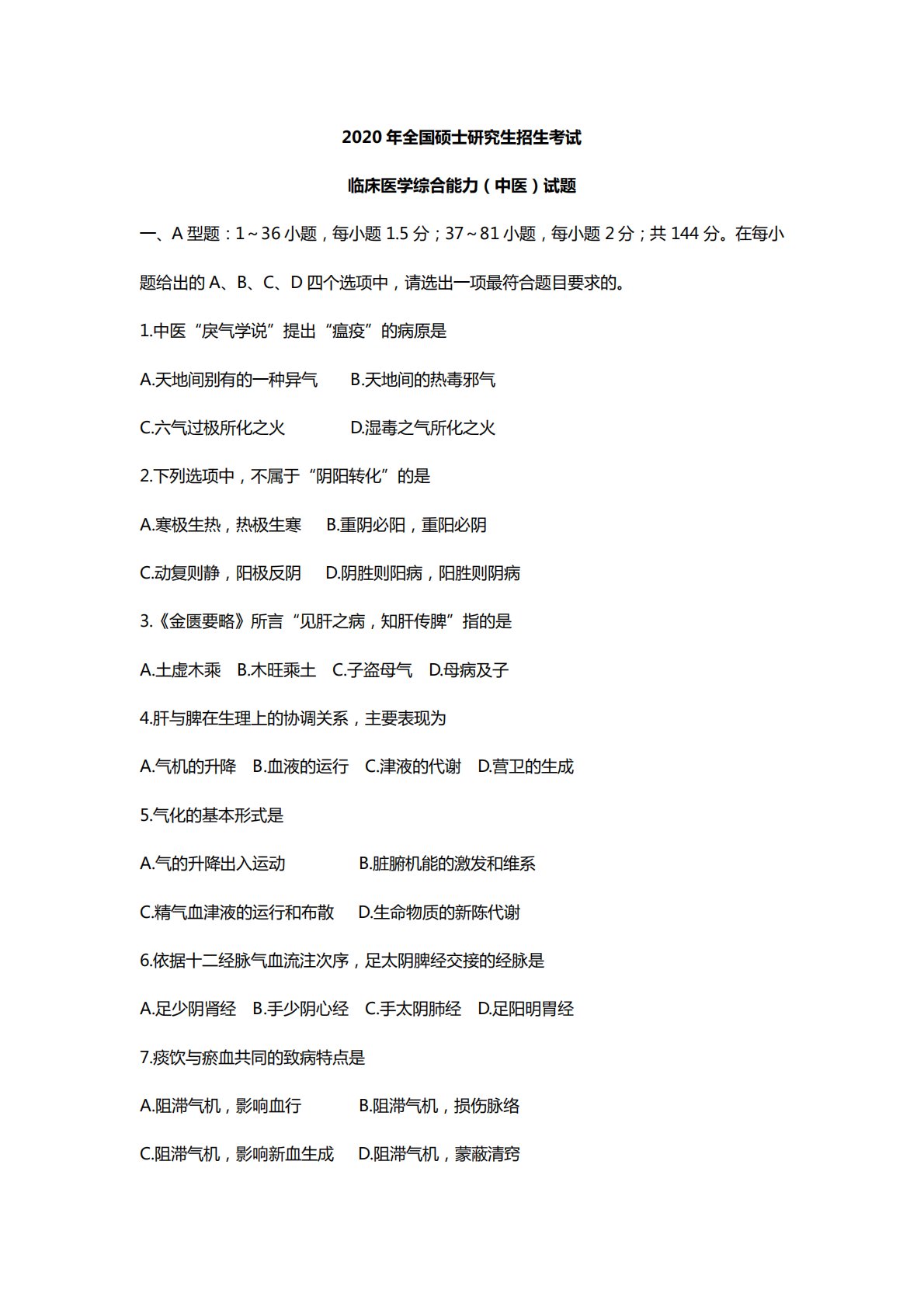 2020年全国硕士研究生招生考试临床医学综合能力(中医)试题一、A型题:1~36小题,每小题1.5分;37~81小题,每小题2分;共144分。在每小题给出的A、B、C、D四个选项中,请选出一项最符合题目要求的。1.中医“戾气学说”提出“瘟疫”的病原是A.天地间别有的一种异气B.天地间的热毒邪气C.六气过极所化之火D.湿毒之气所化之火2.下列选项中,不属于“阴阳转化”的是A.寒极生热,热极生寒B.重阴必阳,重阳必阴C.动复则静,阳极反阴D.阴胜则阳病,阳胜则阴病3.《金匮要略》所言“见肝之病,知肝传脾”指的是A.土虚木乘B.木旺乘土C.子盗母气D.母病及子4.肝与脾在生理上的协调关系,主要表现为...