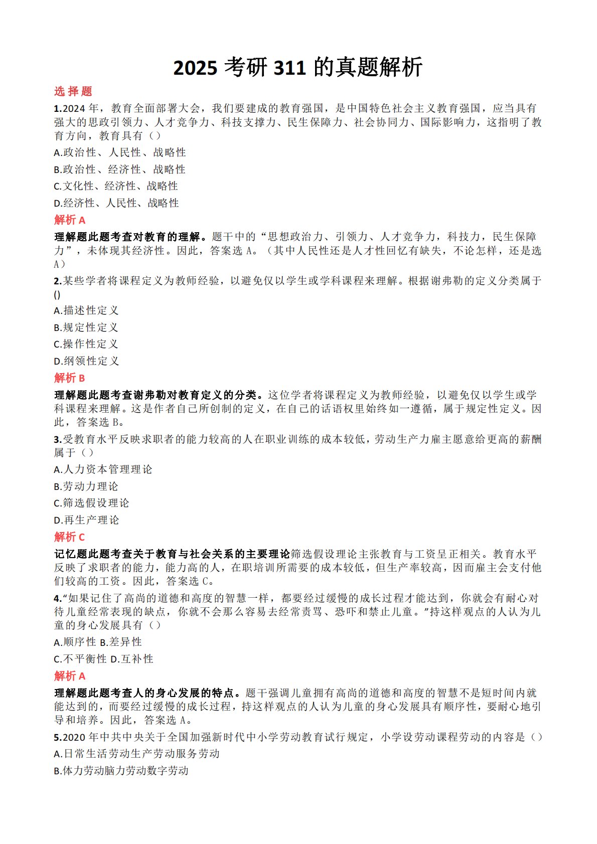 2025考研311的真题解析选择题1.2024年,教育全面部署大会,我们要建成的教育强国,是中国特色社会主义教育强国,应当具有强大的思政引领力、人才竞争力、科技支撑力、民生保障力、社会协同力、国际影响力,这指明了教育方向,教育具有()A.政治性、人民性、战略性B.政治性、经济性、战略性C.文化性、经济性、战略性D.经济性、人民性、战略性解析A理解题此题考查对教育的理解。题干中的“思想政治力、引领力、人才竞争力,科技力,民生保障力”,未体现其经济性。因此,答案选A。(其中人民性还是人才性回忆有缺失,不论怎样,还是选A)2.某些学者将课程定义为教师经验,以避免仅以学生或学科课程来理解。根据谢弗勒的...