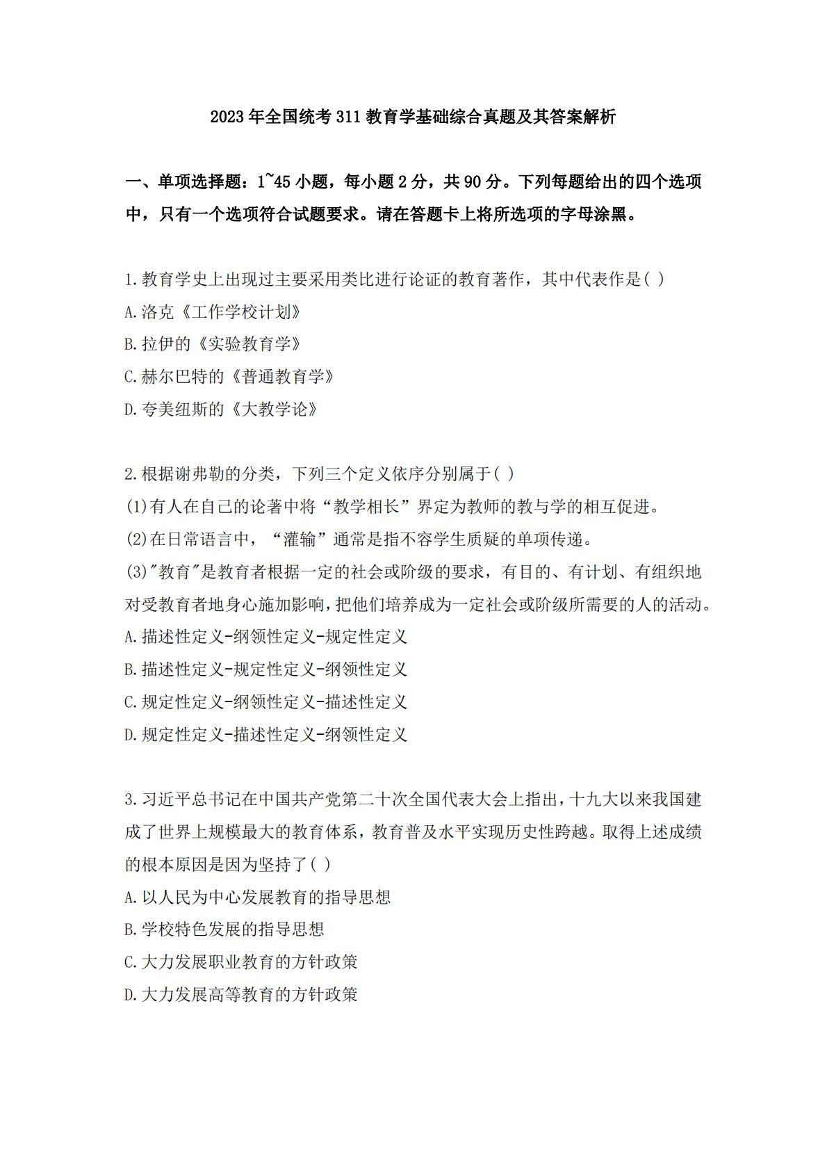 2023年全国统考311教育学基础综合真题及其答案解析一、单项选择题:1~45小题,每小题2分,共90分。下列每题给出的四个选项中,只有一个选项符合试题要求。请在答题卡上将所选项的字母涂黑。1.教育学史上出现过主要采用类比进行论证的教育著作,其中代表作是()A.洛克《工作学校计划》B.拉伊的《实验教育学》C.赫尔巴特的《普通教育学》D.夸美纽斯的《大教学论》2.根据谢弗勒的分类,下列三个定义依序分别属于()(1)有人在自己的论著中将“教学相长”界定为教师的教与学的相互促进。(2)在日常语言中,“灌输”通常是指不容学生质疑的单项传递。(3)"教育"是教育者根据一定的社会或阶级的要求,有目的、有计...