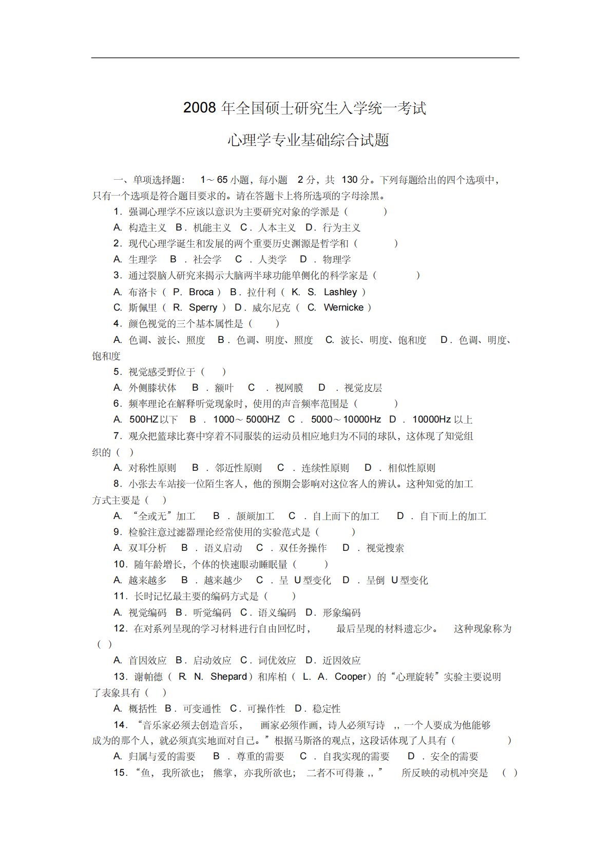 2008ÄêÈ«¹ú˶ʿÑо¿ÉúÈëѧͳһ¿¼ÊÔÐÄÀíѧרҵ»ù´¡×ÛºÏÊÔÌâÒ»¡¢µ¥ÏîÑ¡ÔñÌ⣺1¡«65СÌ⣬ÿСÌâ2·Ö£¬¹²130·Ö¡£ÏÂÁÐÿÌâ¸ø³öµÄËĸöÑ¡ÏîÖУ¬Ö»ÓÐÒ»¸öÑ¡ÏîÊÇ·ûºÏÌâĿҪÇóµÄ¡£ÇëÔÚ´ðÌ⿨ÉϽ«ËùÑ¡ÏîµÄ×ÖĸͿºÚ¡£1£®Ç¿µ÷ÐÄÀíѧ²»Ó¦¸ÃÒÔÒâʶΪÖ÷ÒªÑо¿¶ÔÏóµÄѧÅÉÊÇ£¨£©A£®¹¹ÔìÖ÷ÒåB£®»úÄÜÖ÷ÒåC£®È˱¾Ö÷ÒåD£®ÐÐΪÖ÷Òå2£®ÏÖ´úÐÄÀíѧµ®É...