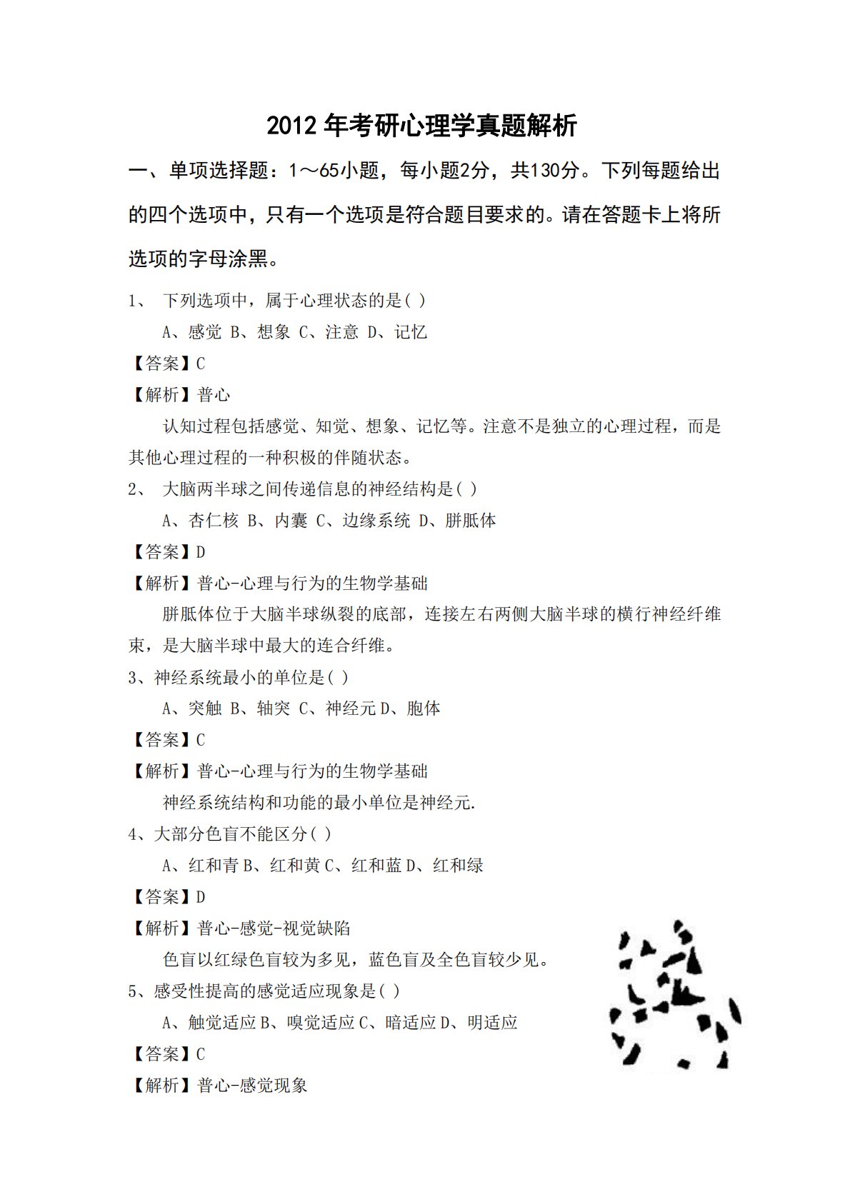 2012年考研心理学真题解析一、单项选择题:1~65小题,每小题2分,共130分。下列每题给出的四个选项中,只有一个选项是符合题目要求的。请在答题卡上将所选项的字母涂黑。1、下列选项中,属于心理状态的是()A、感觉B、想象C、注意D、记忆【答案】C【解析】普心认知过程包括感觉、知觉、想象、记忆等。注意不是独立的心理过程,而是其他心理过程的一种积极的伴随状态。2、大脑两半球之间传递信息的神经结构是()A、杏仁核B、内囊C、边缘系统D、胼胝体【答案】D【解析】普心-心理与行为的生物学基础胼胝体位于大脑半球纵裂的底部,连接左右两侧大脑半球的横行神经纤维束,是大脑半球中最大的连合纤维。3、神经系统最小...