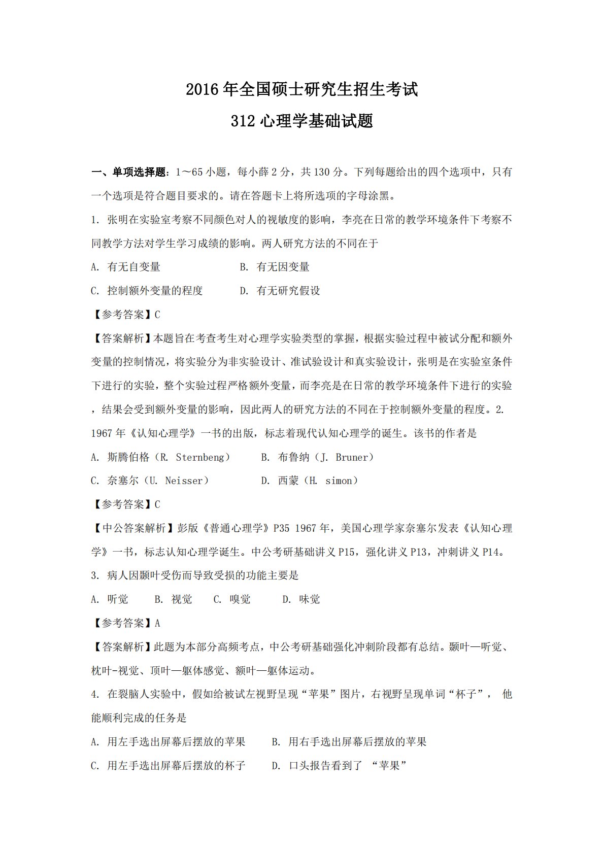 2016年全国硕士研究生招生考试312心理学基础试题一、单项选择题:1〜65小题,每小薛2分,共130分。下列每题给出的四个选项中,只有一个选项是符合题目要求的。请在答题卡上将所选项的字母涂黑。1.张明在实验室考察不同颜色对人的视敏度的影响,李亮在日常的教学环境条件下考察不同教学方法对学生学习成绩的影响。两人研究方法的不同在于A.有无自变量B.有无因变量C.控制额外变量的程度D.有无研究假设【参考答案】C【答案解析】本题旨在考查考生对心理学实验类型的掌握,根据实验过程中被试分配和额外变量的控制情况,将实验分为非实验设计、准试验设计和真实验设计,张明是在实验室条件下进行的实验,整个实验过程严格额...