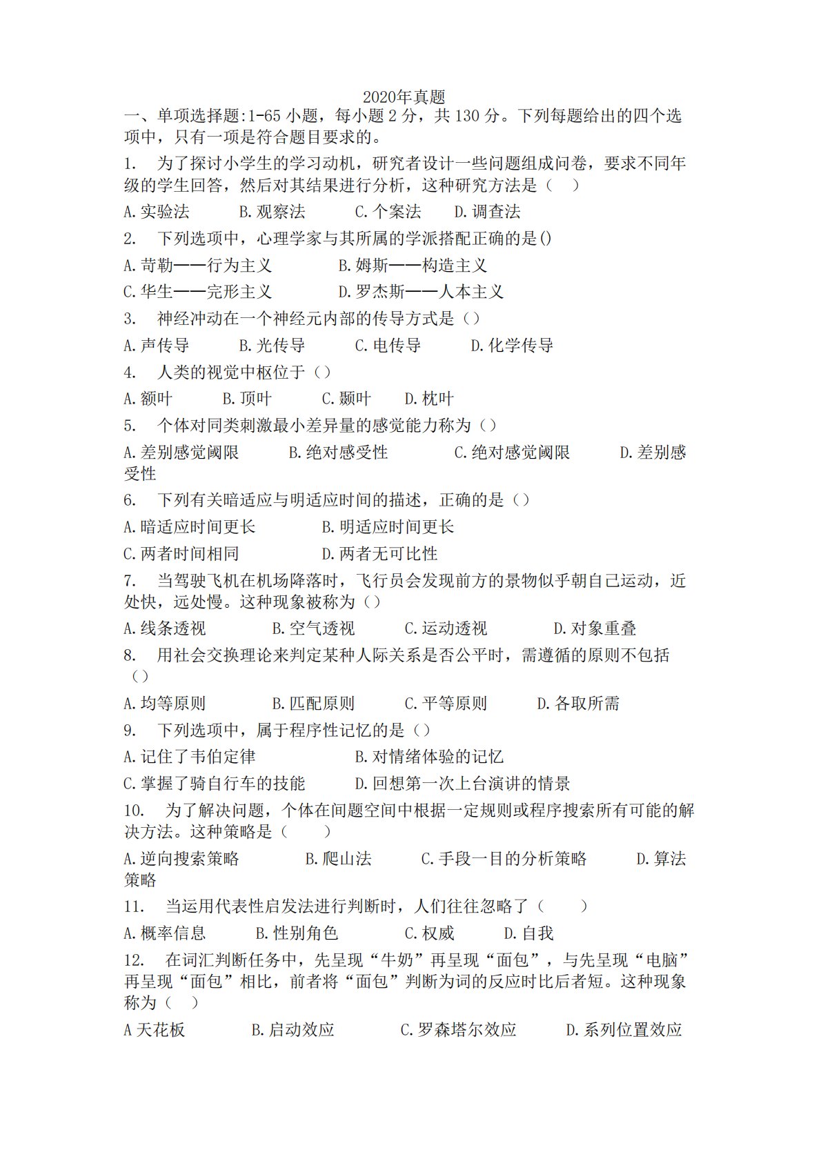 A.实验法B.观察法C.个案法D.调查法2.下列选项中,心理学家与其所属的学派搭配正确的是()A.苛勒——行为主义B.姆斯——构造主义C.华生——完形主义D.罗杰斯——人本主义3.神经冲动在一个神经元内部的传导方式是()A.声传导B.光传导C.电传导D.化学传导4.人类的视觉中枢位于()A.额叶B.顶叶C.颞叶D.枕叶5.个体对同类刺激最小差异量的感觉能力称为()A.差别感觉阈限B.绝对感受性C.绝对感觉阈限D.差别感受性6.下列有关暗适应与明适应时间的描述,正确的是()A.暗适应时间更长B.明适应时间更长C.两者时间相同D.两者无可比性7.当驾驶飞机在机场降落时,飞行员会发现前方的景物似乎朝...