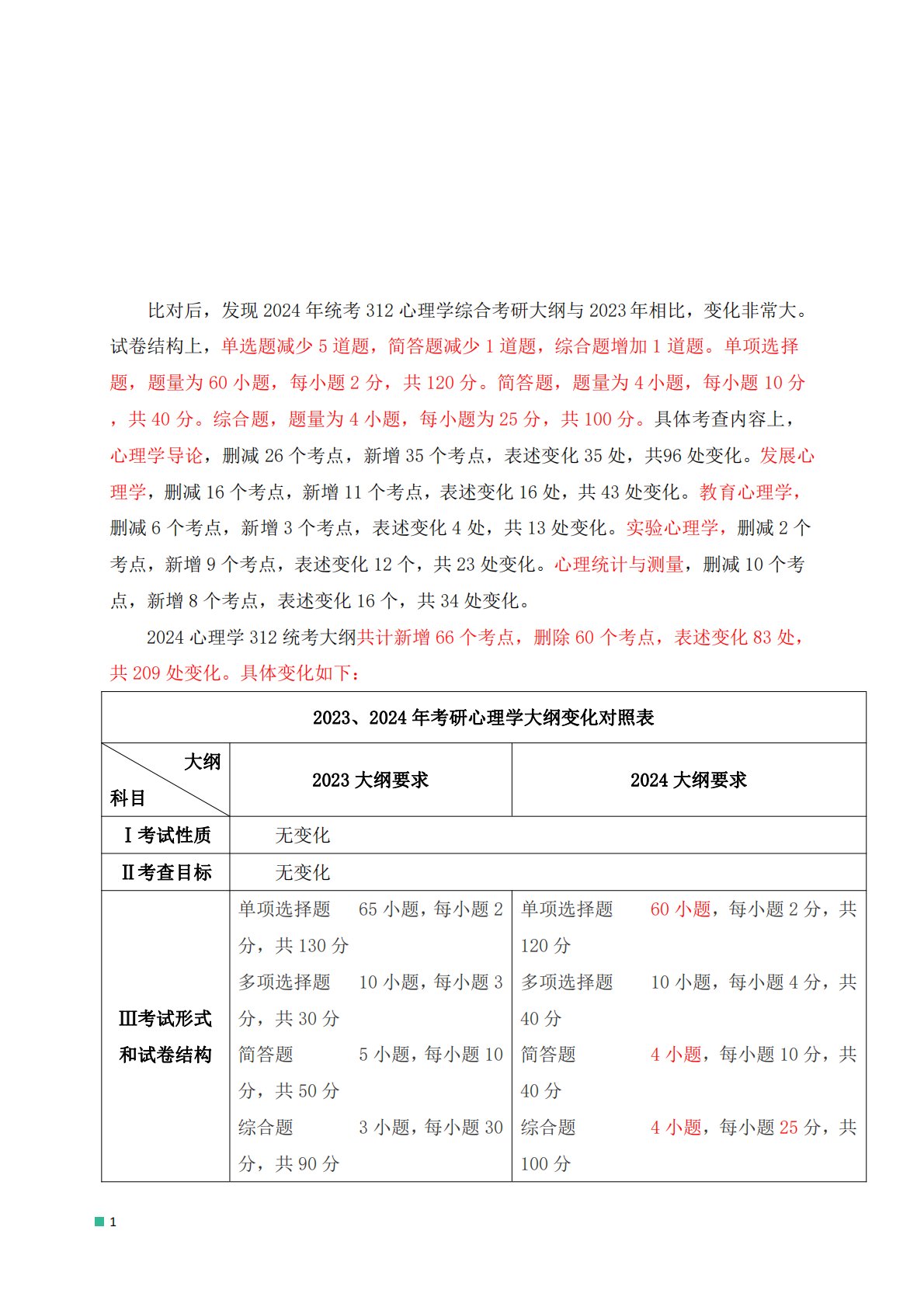12024心理学312统考大纲共计新增66个考点,删除60个考点,表述变化83处,共209处变化。具体变化如下比对后,发现2024年统考312心理学综合考研大纲与2023年相比,变化非常大。试卷结构上,单选题减少5道题,简答题减少1道题,综合题增加1道题。单项选择题,题量为60小题,每小题2分,共120分。简答题,题量为4小题,每小题10分,共40分。综合题,题量为4小题,每小题为25分,共100分。具体考查内容上,心理学导论,删减26个考点,新增35个考点,表述变化35处,共96处变化。发展心理学,删减16个考点,新增11个考点,表述变化16处,共43处变化。教育心理学,删减6个考点,新增3...