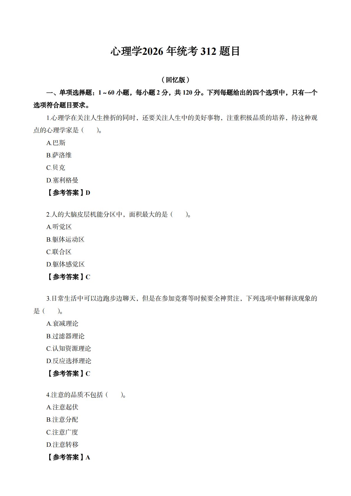 (心理学2026年统考312题目回忆版)一、单项选择题:1~60小题,每小题2分,共120分。下列每题给出的四个选项中,只有一个选项符合题目要求。1.心理学在关注人生挫折的同时,还要关注人生中的美好事物,注重积极品质的培养,持这种观点的心理学家是()。A.巴斯B.萨洛维C.贝克D.塞利格曼【参考答案】D2.人的大脑皮层机能分区中,面积最大的是()。A.听觉区B.躯体运动区C.联合区D.躯体感觉区【参考答案】C3.日常生活中可以边跑步边聊天,但是在参加竞赛等时候要全神贯注,下列选项中解释该现象的是()。A.衰减理论B.过滤器理论C.认知资源理论D.反应选择理论【参考答案】C4.注意的品质不包括(...