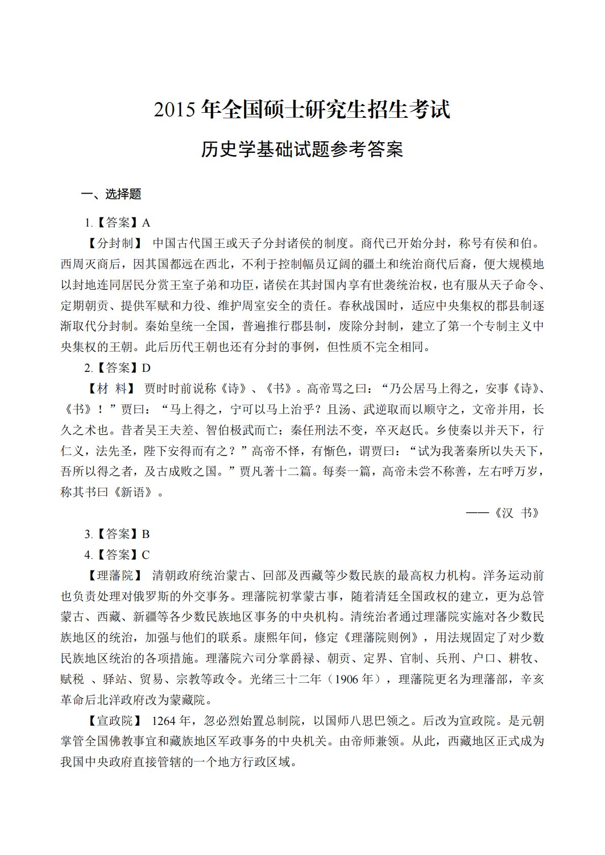 2015年全国硕士研究生招生考试历史学基础试题参考答案一、选择题1.【答案】A【分封制】中国古代国王或天子分封诸侯的制度。商代已开始分封,称号有侯和伯。西周灭商后,因其国都远在西北,不利于控制幅员辽阔的疆土和统治商代后裔,便大规模地以封地连同居民分赏王室子弟和功臣,诸侯在其封国内享有世袭统治权,也有服从天子命令、定期朝贡、提供军赋和力役、维护周室安全的责任。春秋战国时,适应中央集权的郡县制逐渐取代分封制。秦始皇统一全国,普遍推行郡县制,废除分封制,建立了第一个专制主义中央集权的王朝。此后历代王朝也还有分封的事例,但性质不完全相同。2.【答案】D【材料】贾时时前说称《诗》、《书》。高帝骂之曰:“...