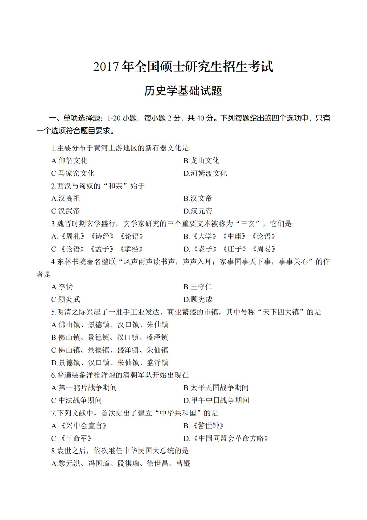 2017年全国硕士研究生招生考试历史学基础试题一、单项选择题:1-20小题,每小题2分,共40分。下列每题给出的四个选项中,只有一个选项符合题目要求。1.主要分布于黄河上游地区的新石器文化是A.仰韶文化B.龙山文化C.马家窑文化D.河姆渡文化2.西汉与匈奴的“和亲”始于A.汉高祖B.汉文帝C.汉武帝D.汉元帝3.魏晋时期玄学盛行,玄学家研究的三个重要文本被称为“三玄”,它们是A.《周礼》《诗经》《论语》B.《大学》《中庸》《论语》C.《论语》《孟子》《孝经》D.《老子》《庄子》《周易》4.东林书院著名楹联“风声雨声读书声,声声入耳;家事国事天下事,事事关心”的作者是A.李贽B.王守仁C.顾炎武...