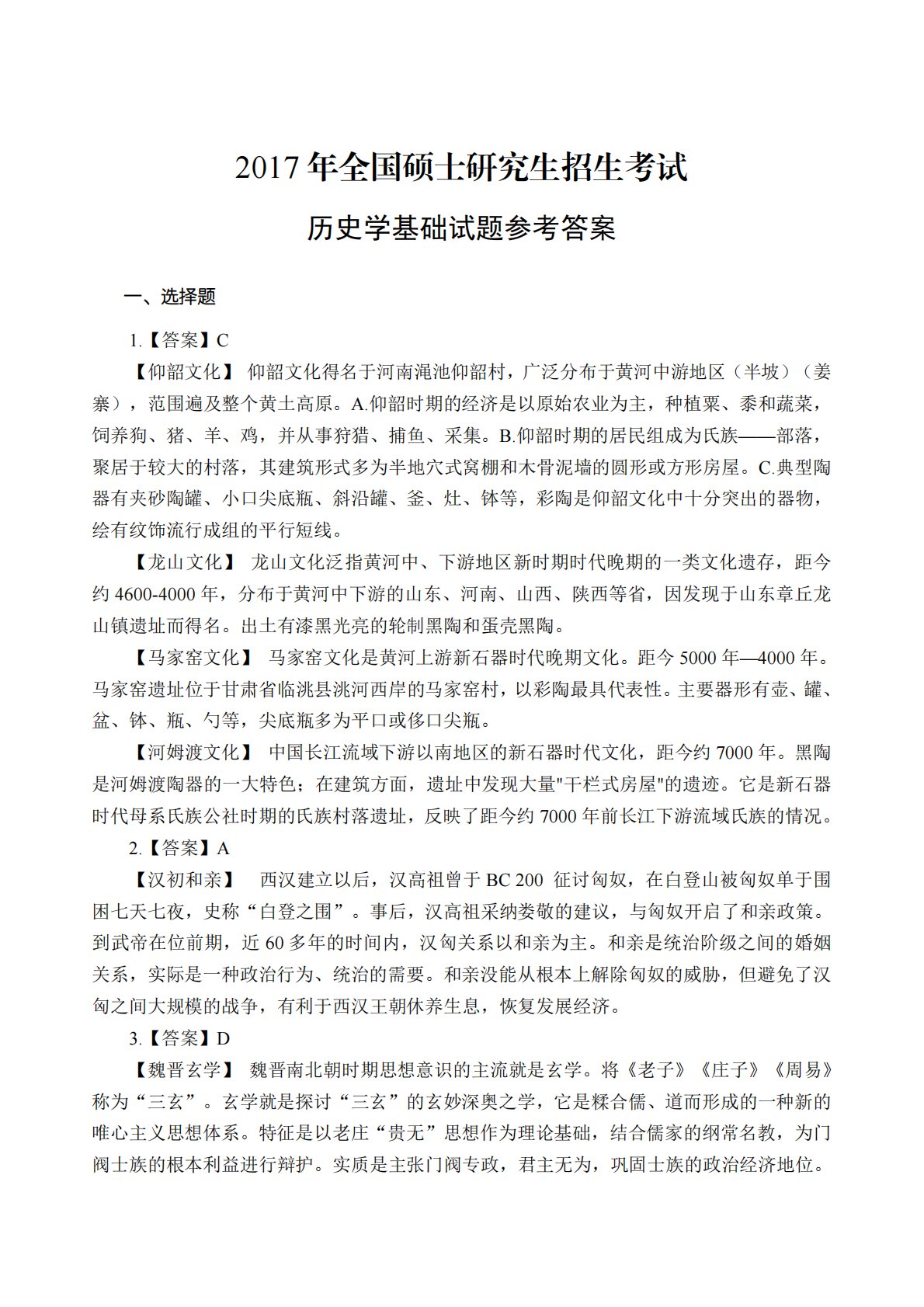 2017年全国硕士研究生招生考试历史学基础试题参考答案一、选择题1.【答案】C【仰韶文化】仰韶文化得名于河南渑池仰韶村,广泛分布于黄河中游地区(半坡)(姜寨),范围遍及整个黄土高原。A.仰韶时期的经济是以原始农业为主,种植粟、黍和蔬菜,饲养狗、猪、羊、鸡,并从事狩猎、捕鱼、采集。B.仰韶时期的居民组成为氏族——部落,聚居于较大的村落,其建筑形式多为半地穴式窝棚和木骨泥墙的圆形或方形房屋。C.典型陶器有夹砂陶罐、小口尖底瓶、斜沿罐、釜、灶、钵等,彩陶是仰韶文化中十分突出的器物,绘有纹饰流行成组的平行短线。【龙山文化】龙山文化泛指黄河中、下游地区新时期时代晚期的一类文化遗存,距今约4600-400...