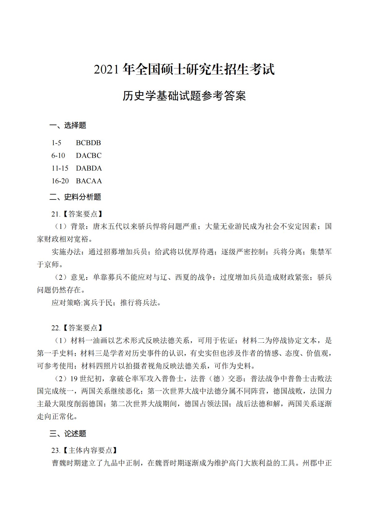 2021年全国硕士研究生招生考试历史学基础试题参考答案一、选择题1-5BCBDB6-10DACBC11-15DABDA16-20BACAA二、史料分析题21.【答案要点】(1)背景:唐末五代以来骄兵悍将问题严重;大量无业游民成为社会不安定因素;国家财政相对宽裕。实施办法:通过招募增加兵员;给武将以优厚待遇;逐级严密控制;兵将分离;集禁军于京师。(2)意见:单靠募兵不能应对与辽、西夏的战争;过度增加兵员造成财政紧张;骄兵问题仍然存在。应对策略:寓兵于民;推行将兵法。22.【答案要点】(1)材料一油画以艺术形式反映法德关系,可用于佐证;材料二为停战协定文本,是第一手史料;材料三是学者对历史事件的认...