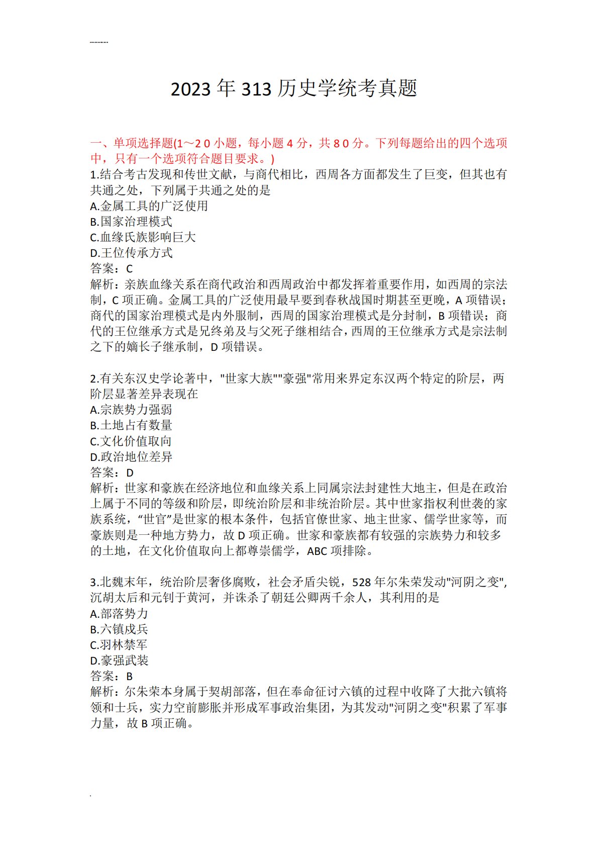 给如果给改革给给给嗯嗯额分给额个额发2023年313历史学统考真题一、单项选择题(1~20小题,每小题4分,共80分。下列每题给出的四个选项中,只有一个选项符合题目要求。)1.结合考古发现和传世文献,与商代相比,西周各方面都发生了巨变,但其也有共通之处,下列属于共通之处的是A.金属工具的广泛使用B.国家治理模式C.血缘氏族影响巨大D.王位传承方式答案:C解析:亲族血缘关系在商代政治和西周政治中都发挥着重要作用,如西周的宗法制,C项正确。金属工具的广泛使用最早要到春秋战国时期甚至更晚,A项错误;商代的国家治理模式是内外服制,西周的国家治理模式是分封制,B项错误;商代的王位继承方式是兄终弟及与父死...