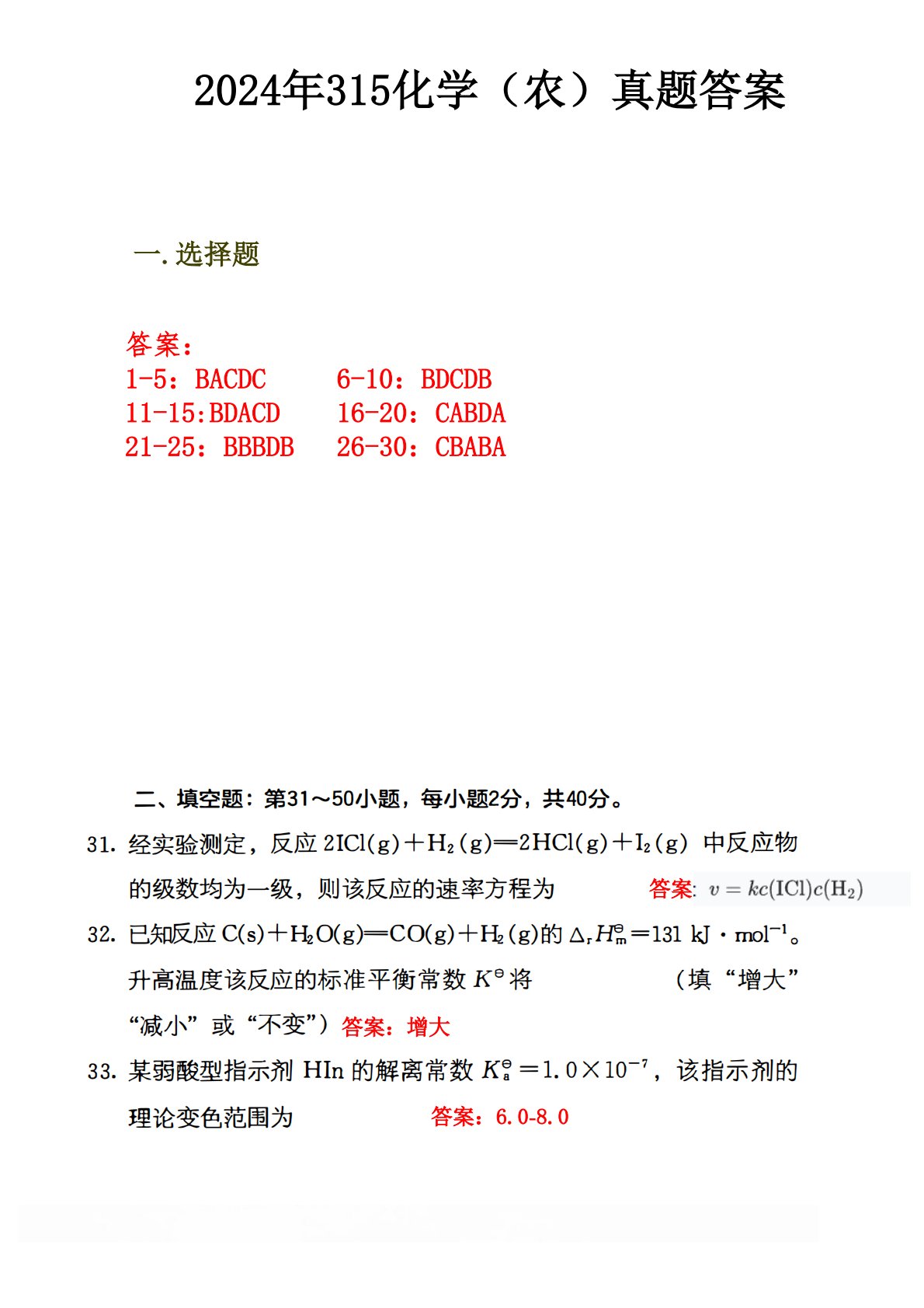 二、填空题:第31~50小题,每小题2分,共40分。31.经实验测定,反应2ICl(g)+H2(g)=2HCl(g)+12(g)中反应物的级数均为一级,则该反应的速率方程为(1)32.已知反应C(s)+H20(g)=CO(g)+压(g)的D.rH炉=131kJ•mo尸。升高溫度该反应的标准平衡常数Ke将(2)。(填“增大”“减小”或“不变”)33.某弱酸型指示剂Hin的解离常数K�=l.0X10-1,该指示剂的理论变色范围为(3)。72I2025年全国硕士研究生招生考试农学门类考试大纲答案:答案:增大答案:6.0-8.02024年315化学(农)真题答案一.选择题答案:1-5:BACDC6-1...