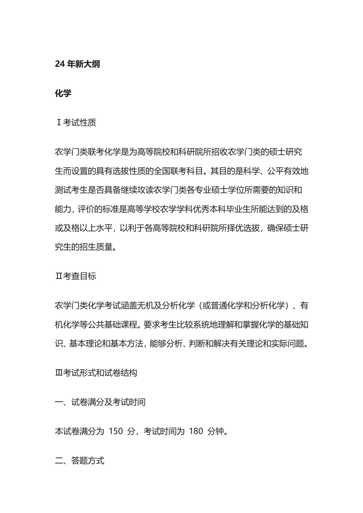 24年新大纲化学Ⅰ考试性质农学门类联考化学是为高等院校和科研院所招收农学门类的硕士研究生而设置的具有选拔性质的全国联考科目。其目的是科学、公平有效地测试考生是否具备继续攻读农学门类各专业硕士学位所需要的知识和能力,评价的标准是高等学校农学学科优秀本科毕业生所能达到的及格或及格以上水平,以利于各高等院校和科硏院所择优选拔,确保硕士研究生的招生质量。Ⅱ考查目标农学门类化学考试涵盖无机及分析化学(或普通化学和分析化学)、有机化学等公共基础课程。要求考生比较系统地理解和掌握化学的基础知识、基本理论和基本方法,能够分析、判断和解决有关理论和实际问题。Ⅲ考试形式和试卷结构一、试卷满分及考试时间本试卷满分为...