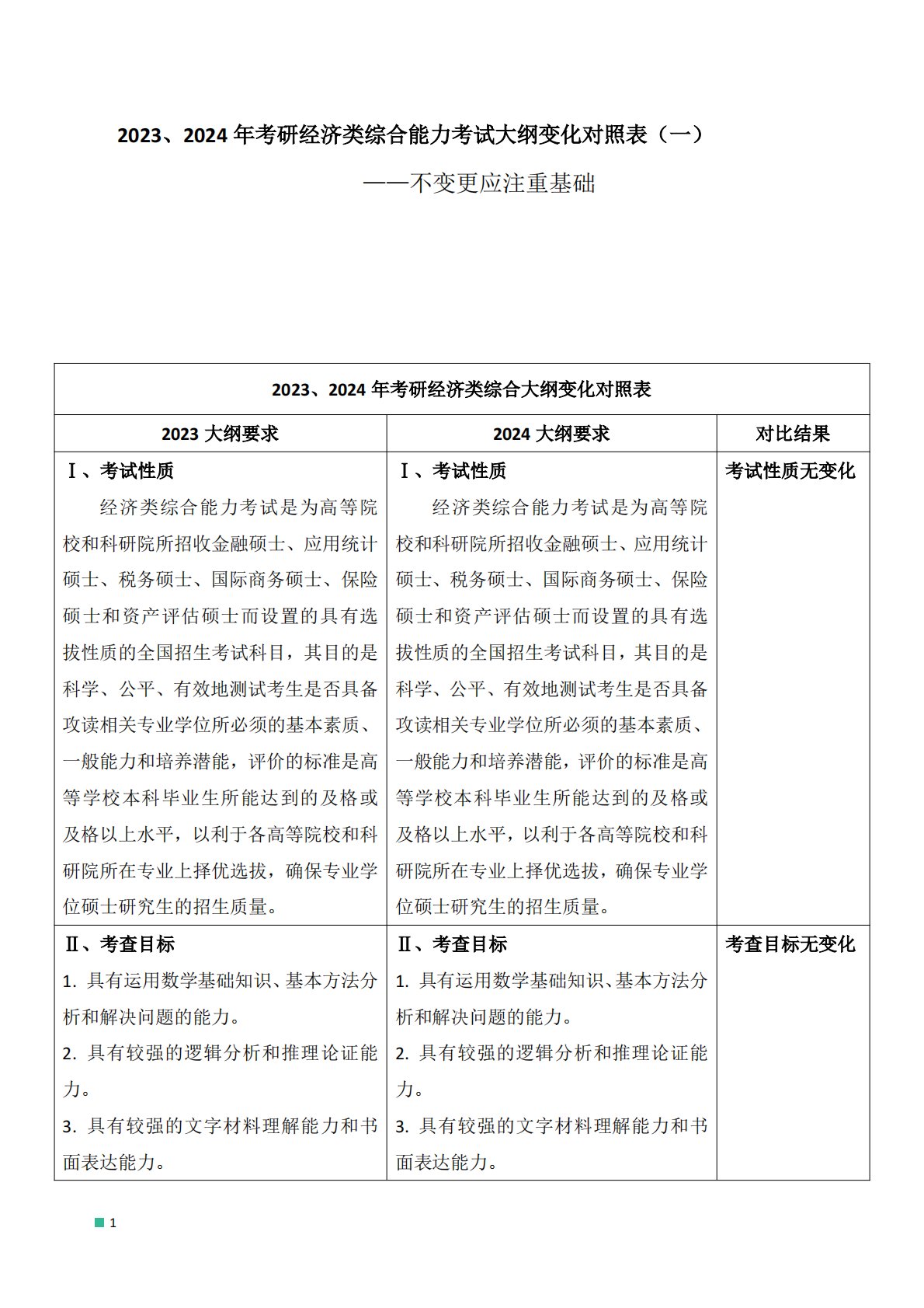 1——不变更应注重基2023、2024年考研经济类综合能力考试大纲变化对照表(一)础2023、2024年考研经济类综合大纲变化对照表2023大纲要求2024大纲要求对比结果Ⅰ、考试性质经济类综合能力考试是为高等院校和科研院所招收金融硕士、应用统计硕士、税务硕士、国际商务硕士、保险硕士和资产评估硕士而设置的具有选拔性质的全国招生考试科目,其目的是科学、公平、有效地测试考生是否具备攻读相关专业学位所必须的基本素质、一般能力和培养潜能,评价的标准是高等学校本科毕业生所能达到的及格或及格以上水平,以利于各高等院校和科研院所在专业上择优选拔,确保专业学位硕士研究生的招生质量。Ⅰ、考试性质经济类综合能力考...