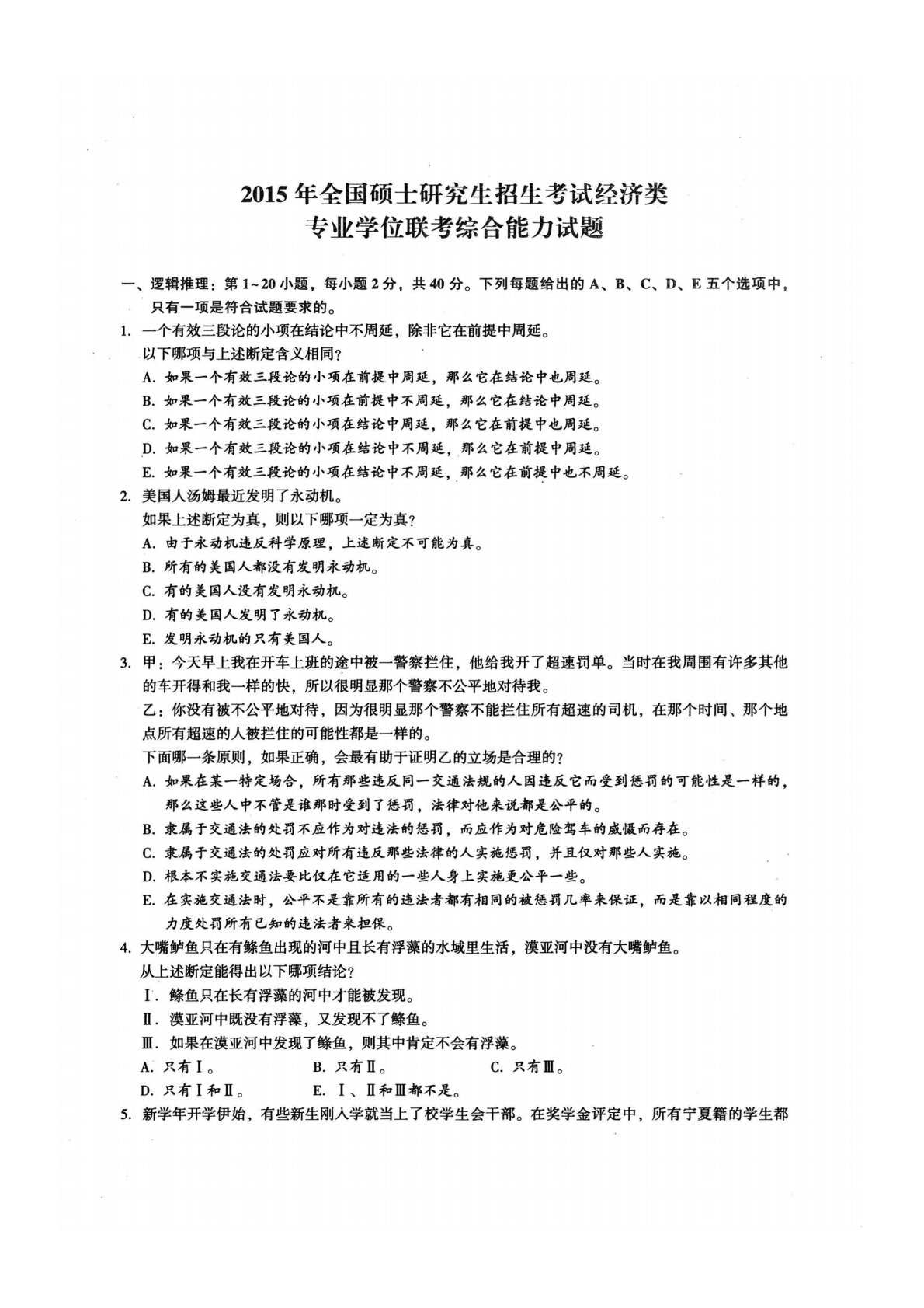 2015年全国硕士研究生招生考试经济类专业学位联考综合能力试题一、逻辑推理:第1〜2。小题,每小题2分,共4Q分。下列每题给出的A、B、C、D、E五个选项中,只有一项是符合试题要求的。1.一个有效三段论的小项在结论中不周延,除非它在前提中周延。以下哪项与上述断定含义相同?A.如果一个有效三段论的小项在前提中周延,那么它在结论中也周延。B.如果一个有效三段论的小项在前提中不周延,那么它在结论中周延。C.如果一个有效三段论的小项在结论中周延,那么它在前提中也周延。D.如果一个有效三段论的小项在结论中不周延,那么它在前提中周延。E.如果一个有效三段论的小项在结论中不周延,那么它在前提中也不周延。2....
