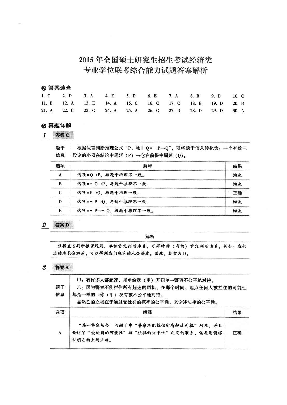 2015年全国硕士研究生招生考试经济类专业学位联考综合能力试题答案解析❷答案速查1.C2.D3.A4.E5.D6.E7.A8.B9.D10.C11.B12.A13.E14.A15.C16.C17.C18.E19.D20.B21.A22.C23.C24.A25.A26.C27.D28.D29.D30.A©真题详解题干根据假言判断推理公式“P,除非Q=[P->Q”,可将题干信息转化为:一个有效三信息段论的小项在结论中周延(P)->它在前提中周延(Q)。选项解释1-结果A选项二Q—P,与题干推理不一致。淘汰B选项=「Q->p,与题干推理不一致。淘汰C选项二P—Q,与题干推理一致。正确D选项二「P—Q...