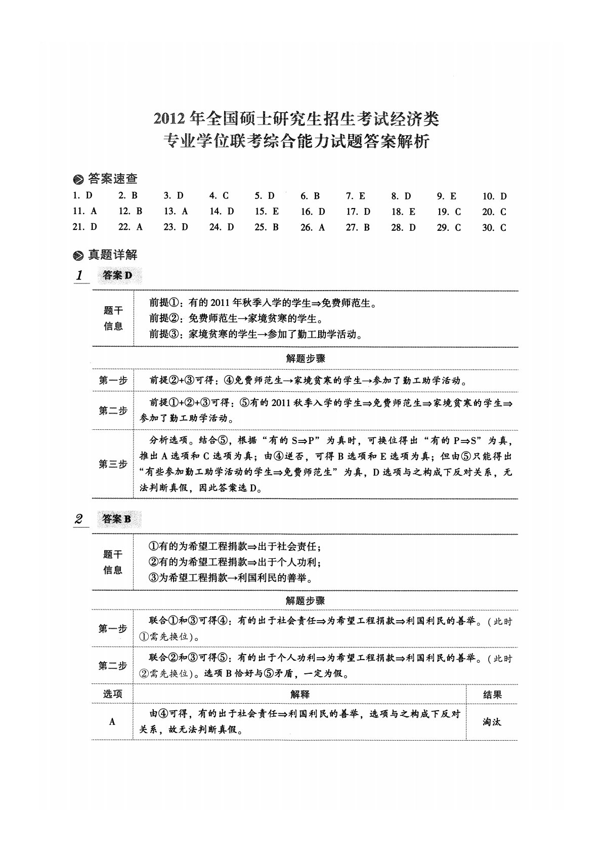 2012年全国硕士研究生招生考试经济类专曲学位联考综合能力试题答案解析龄答案速查1.D2.B3.D4.C5.D6.B7.E8.D9.E10.D11.A12.B13.A14.D15.E16.D17.D18.E19.C20.C21.D22.A23.D24.D25.B26.A27.B28.D29.C30.C数真题详解1答案D.题干信息前提①:有的2011年秋季入学的学生n免费师范生。前提②:免费师范生一家境贫寒的学生。前提③:家境贫寒的学生一参加了勤工助学活动。解题步骤第一步前提②+③可得:④免费师范生一>家境贫寒的学生f参加了勤工助学活动。_-前提①+②+③可得:⑤有的2011秋季入学的学生n免费...