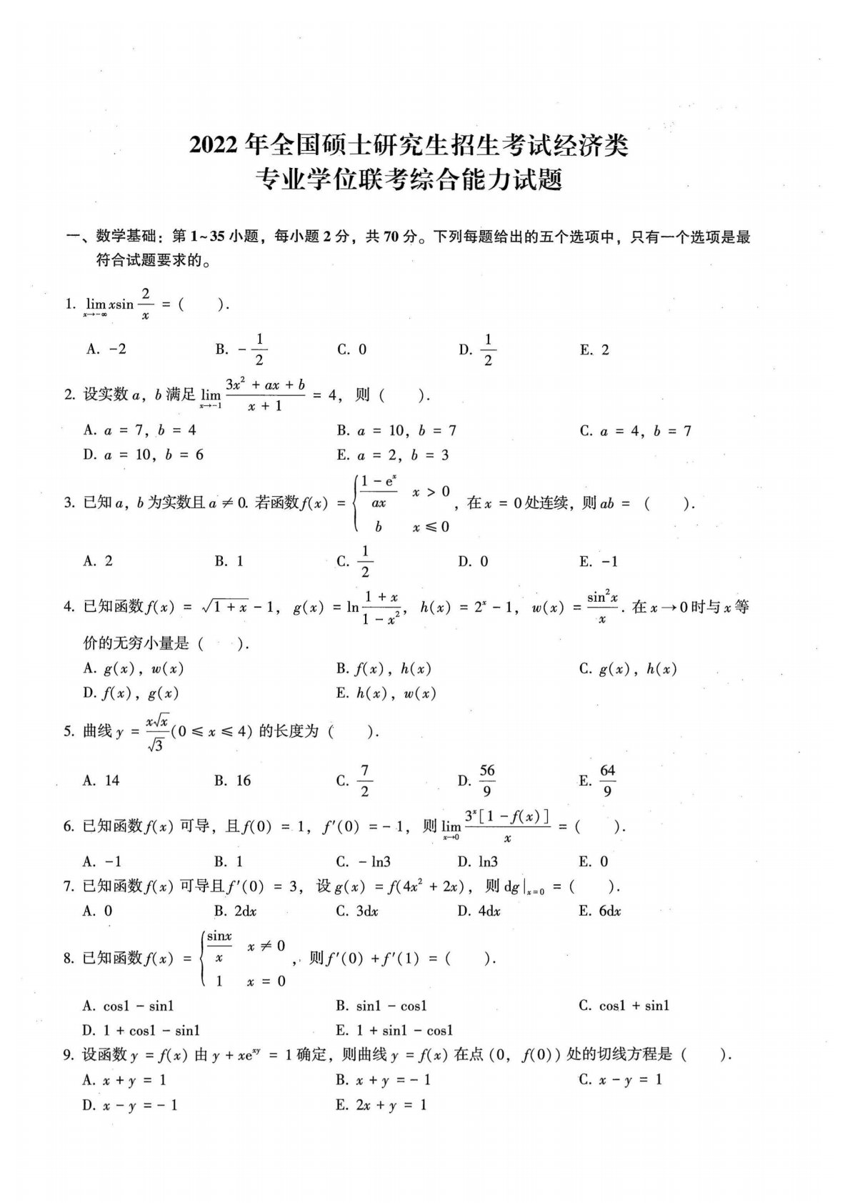 2022年全国硕士研究生招生考试经济类专业学位联考综合能力试题一、数学基础:第1〜35小题,每小题2分,共70分。下列每题给出的五个选项中,只有一个选项是最符合试题要求的。1.limxsin-=().XT-8XA.-2B.----C.0D.—E.2222.设实数a,6满足lim在上”=4,则().%+]A.a=7,6=4B.a=10,6=7C.a=4,6=73.4.5.6.7.8.E.a=2,(1-ex已知a,b为实数且a#0.若函数/(%)=Ia%%>°,在"二0处连续,%W0A.2B.1D.0E.已知函数/(%)=J\+%-1,价的无穷小量是().A.g(%),w(%)D./(%),g(%...