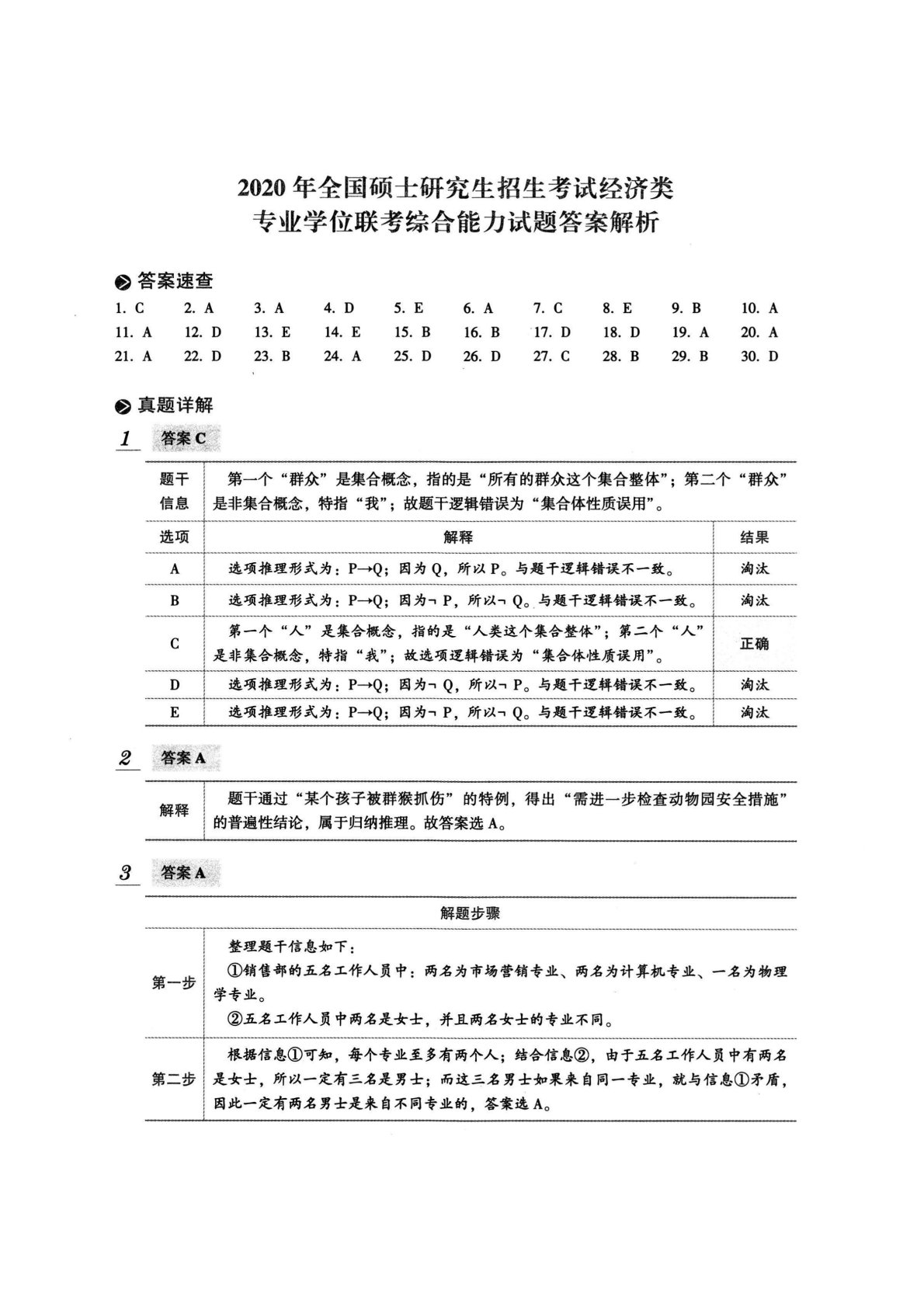 2020年全国硕士研究生招生考试经济类专业学位联考综合能力试题答案解析©答案速查1.C2.A3.A4.D5.E6.A7.C8.E9.B10.A11.A12.D13.E14.E15.B16.B17.D18.D19.A20.A21.A22.D23.B24.A25.D26.D27.C28.B29.B30.D❷真题详解-1--31名番手淆窸;索㈱於胃河;二:二不浮题干信息第一个“群众”是集合概念,指的是“所有的群众这个集合整体”;第二个“群众”是非集合概念,特指“我]故题干逻辑错误为“集合体性质误用”。选项解释结果A选项推理形式为:P-Q;因为Q,所以P。与题干逻辑错误不一致。淘汰B选项推理形式为:P...