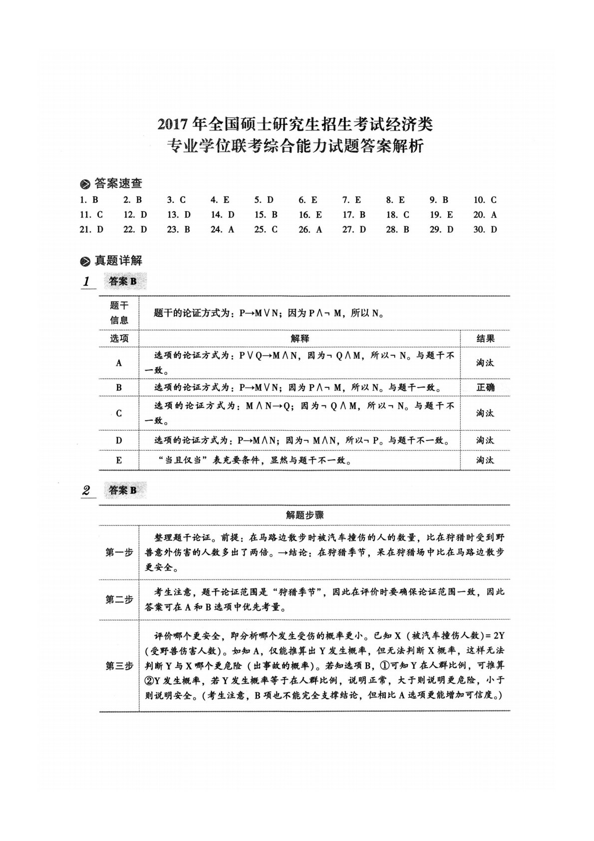 2017年全国硕士研究生招生考试经济类专此学位联考综合能力试题答案解析②答案速查1.B2.B3.C4.E5.D6.E7.E8.E9.B10.C11.C12.D13.D14.D15.B16.E17.B18.C19.E20.A21.D22.D23.B24.A25.C26.A27.D28.B29.D30.D©真题详解1:答案题干I在0I题干的论证方式为:PfMVN;因为P/\「M,所以N。1B息!一连研]丽[—塔惠;选项的论证方式为:PVQTMAN,因为]QAM,所以rN。与题干不!八.A1|淘汰i一致。iB!选项的论证方式为:P—MVN;因为所以N。与题干一致。|正确!选项的论证方式为:MANfQ...