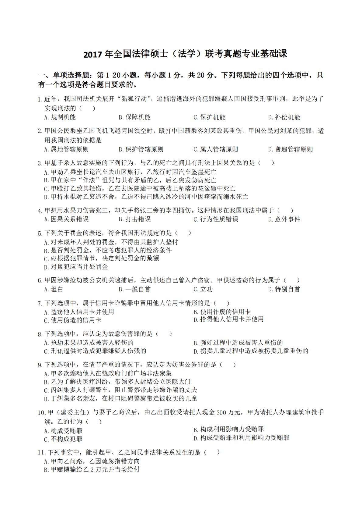2017年全国法律硕士(法学)联考真题专业基础课一、单项选择题:第1-20小题,每小题l分,共20分。下列每题给出的四个选项中,只有一个选项是符合题目要求的。1.近年,我国司法机关展开“猎狐行动”,追捕潜逃海外的犯罪嫌疑人回国接受刑事审判,此举是为了实现刑法的()A.规制机能B.保障机能C.保护机能D.补偿机能2.甲国公民乘坐乙国飞机飞越丙国领空时,殴打中国籍乘客刘某致其重伤。甲国公民对刘某的犯罪,适用我国刑法的依据是A.属地管辖原则B.保护管辖原则C.属人管辖原则D.普遍管辖原则3.甲基千杀人故意实施的下列行为,与乙的死亡之间具有刑法上因果关系的是()A.甲劝乙乘坐长途汽车去山区旅行,乙旅行...