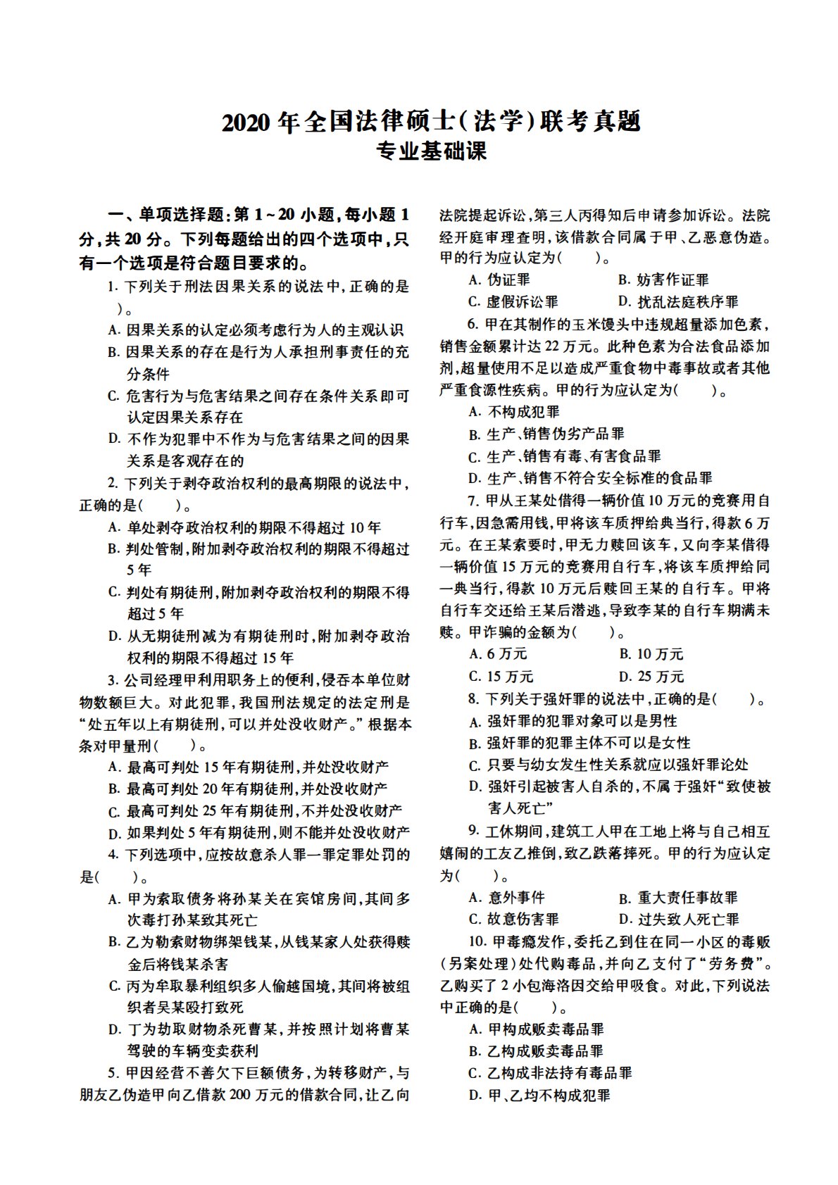 2020年全国法律硕士(法学)联考真题专业基础课一、单项选择题:第1~20小题,每小题1分,共20分。下列每题给出的四个选项中,只有一个选项是符合题目要求的。1.下列关于刑法因果关系的说法中,正确的是)。A.因果关系的认定必须考虑行为人的主观认识B.因果关系的存在是行为人承担刑事责任的充分条件C.危害行为与危害结果之间存在条件关系即可认定因果关系存在D.不作为犯罪中不作为与危害结果之间的因果关系是客观存在的2.下列关于剥夺政治权利的最高期限的说法中,正确的是()。A.单处剥夺政治权利的期限不得超过10年B.判处管制,附加剥夺政治权利的期限不得超过5年C.判处有期徒刑,附加剥夺政治权利的期限不得...