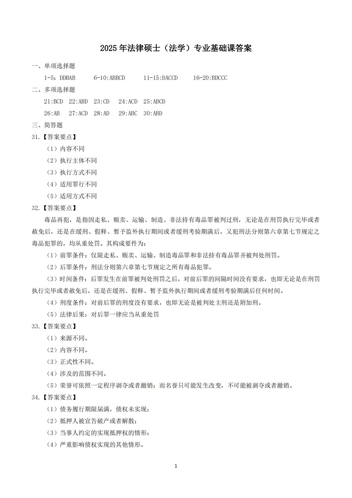 2025年法律硕士(法学)专业基础课答1案6-10:ABBCD11-15:DACCD一、单项选择题1-5:DDBAB二、多项选择16-20:BDCCC题22:ABD27:ACD23:CD28:AD24:ACD29:ABC21:BCD26:AB三、简答25:ABCD30:ABD题31.【答案要点】(1)内容不同(2)执行主体不同(3)执行方式不同(4)适用罪行不同(5)适用方式不同32.【答案要点】毒品再犯,是指因走私、贩卖、运输、制造、非法持有毒品罪被判过刑,无论是在刑罚执行完毕或者赦免后,还是在缓刑、假释、暂予监外执行期间或者缓刑考验期满后,又犯刑法分则第六章第七节规定之毒品犯罪的,均从重处...