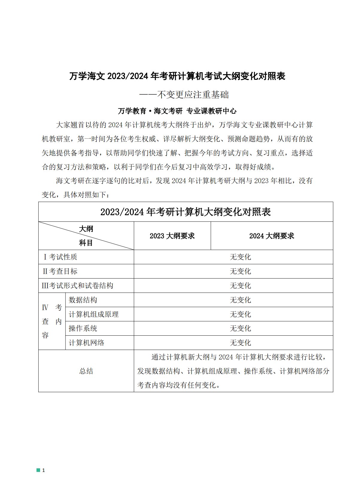 1万学海文2023/2024年考研计算机考试大纲变化对照表——不变更应注重基础万学教育·海文考研专业课教研中心大家翘首以待的2024年计算机统考大纲终于出炉,万学海文专业课教研中心计算机教研室,第一时间为各位考生权威、详尽解析大纲变化、预测命题趋势,从而有的放矢地提供备考指导,以帮助同学们快速了解、把握今年的考试方向、复习重点,选择适合的复习方法和策略,以利于同学们在今后复习中高效学习,取得好成绩。海文考研在逐字逐句的比对后,发现2024年计算机考研大纲与2023年相比,没有变化,具体对照如下:2023/2024年考研计算机大纲变化对照表大纲科目2023大纲要求2024大纲要求Ⅰ考试性质无变化...