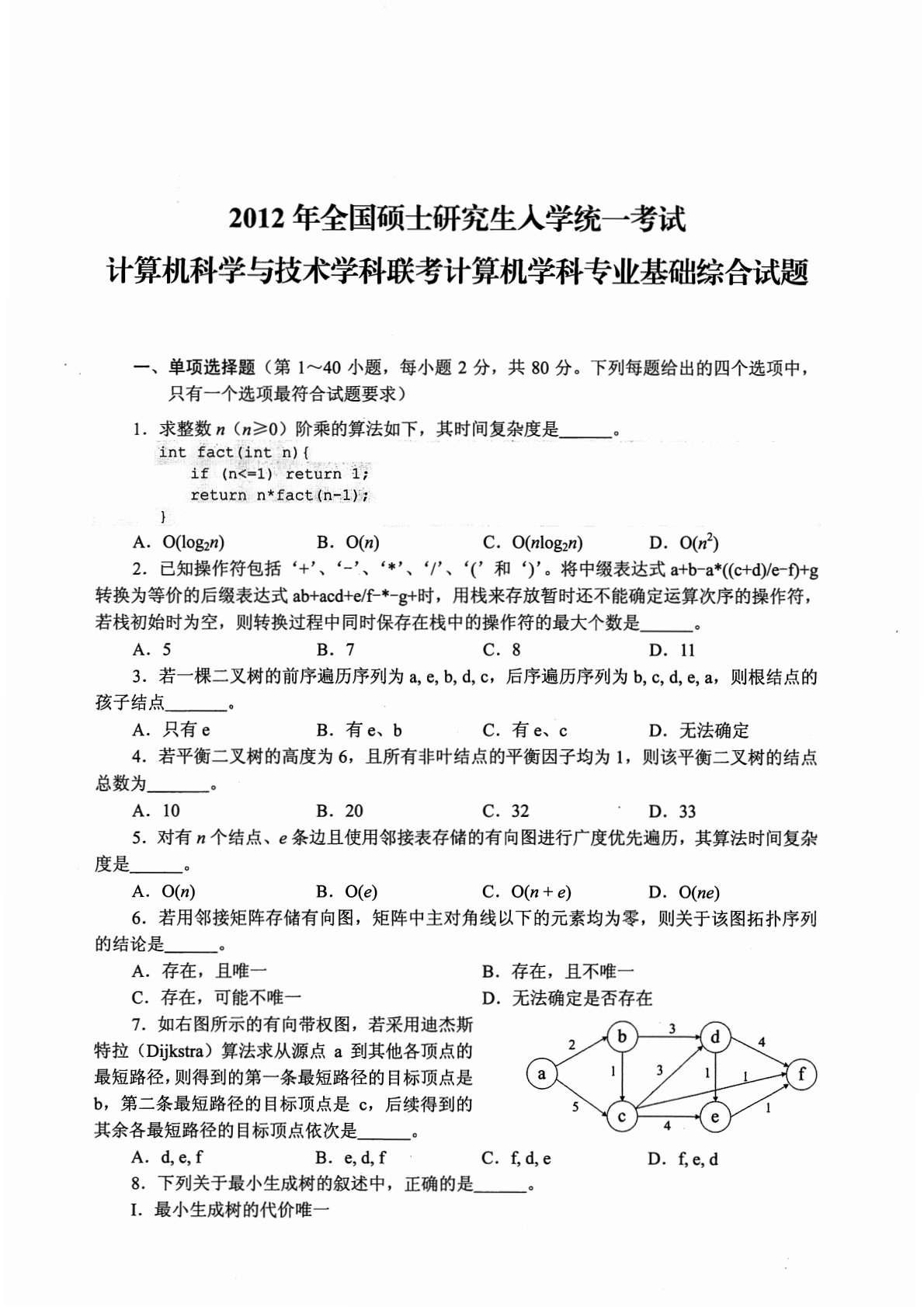 408计算机学科专业基础2012年考研初试真题