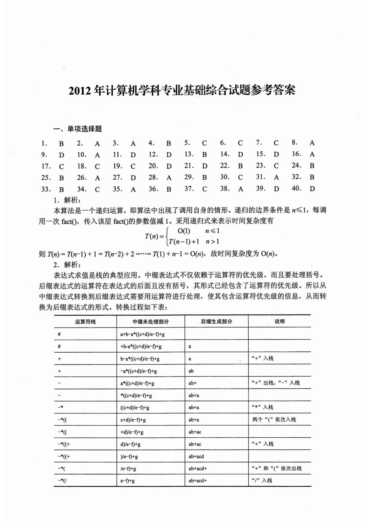 2012年计算机学科专业基础综合试题参考答案一、单项选择题1.B2.A3.A4.B5.C6.C7.C8.A9.D10.A11.D12.D13.B14.D15.D16.A17.C18.C19.C20.D21.D22.B23.C24.B25.B26.A27.D28.A29.B30.C31.A32.B33.B34.C35.A36.B37.C38.A39.D40.D1.解析:本算法是一个递归运算,即算法中出现了调用自身的情形。递归的边界条件是n~l,每调用一次factO,传入该层facto的参数值减l。采用递归式来表示时间复杂度有0(1)n~1T(n)={T(n-1)+1n>1则T(n)=T(n-1)...
