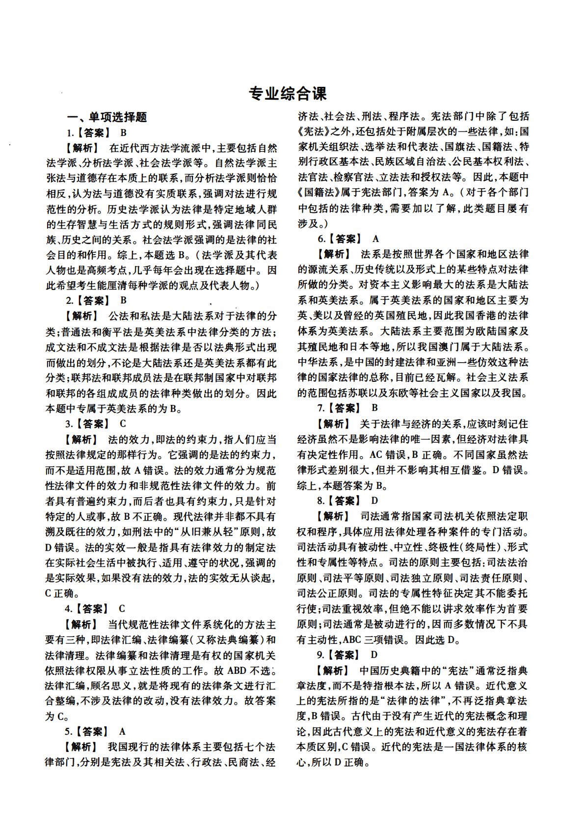 专业综合课一、单项选择题1.【答案】B【解析]在近代西方法学流派中,主要包括自然法学派、分析法学派、社会法学派等。自然法学派主张法与道德存在本质上的联系,而分析法学派则恰恰相反,认为法与道德没有实质联系,强调对法进行规范性的分析。历史法学派认为法律是特定地域人群的生存智慧与生活方式的规则形式,强调法律同民族、历史之间的关系。社会法学派强调的是法律的社会目的和作用。综上,本题选B。(法学派及其代表人物也是高频考点,几乎每年会出现在选择题中。因此希望考生能厘清每种学派的观点及代表入物。)2.【答案】B【解析]公法和私法是大陆法系对于法律的分类;普通法和衡平法是英美法系中法律分类的方法;成文法和不成...