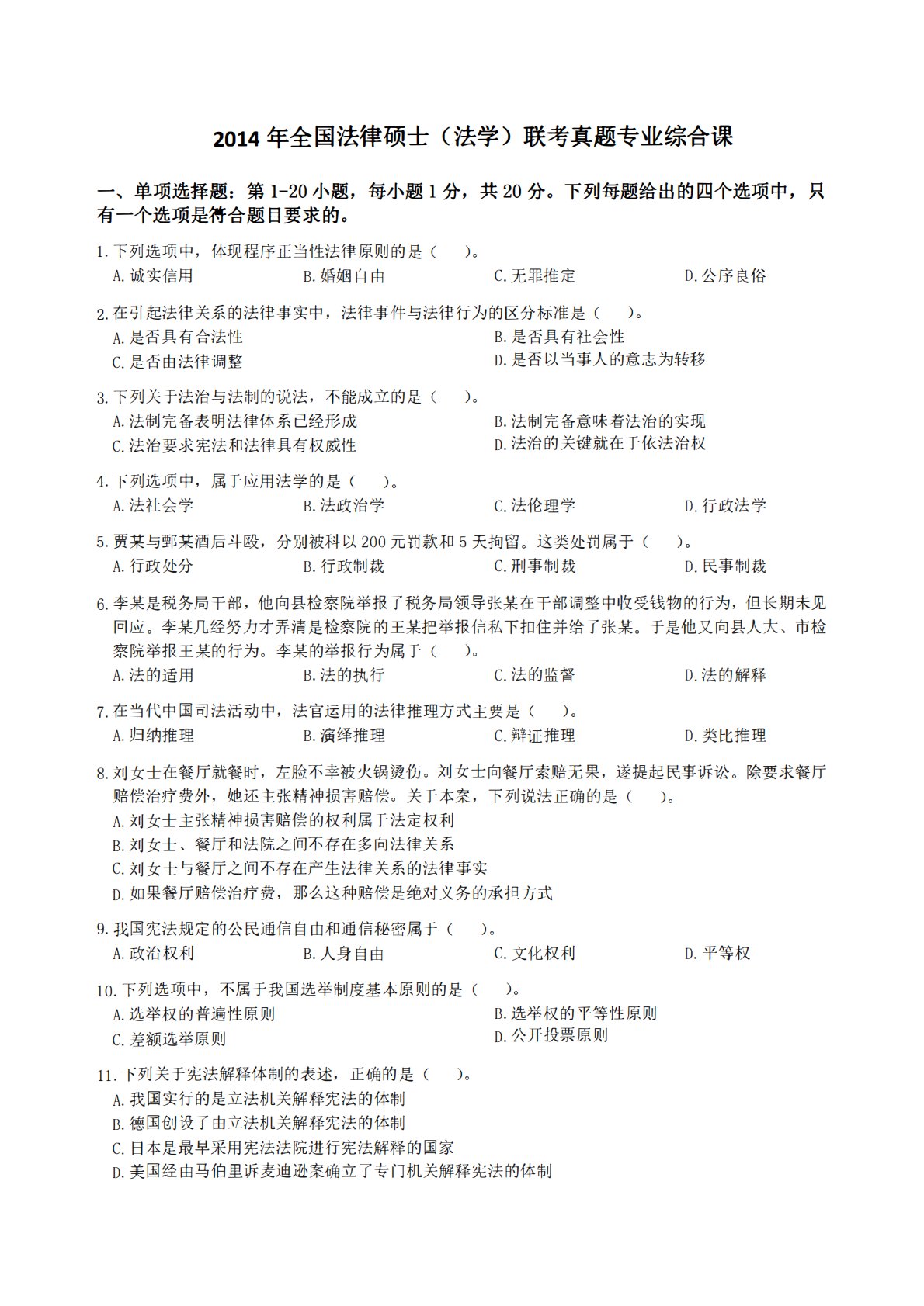 2014年全国法律硕士(法学)联考真题专业综合课一、单项选择题:第1-20小题,每小题l分,共20分。下列每题给出的四个选项中,只有一个选项是符合题目要求的。1.下列选项中,体现程序正当性法律原则的是()。A.诚实信用B.婚姻自由C.无罪推定2.在引起法律关系的法律事实中,法律事件与法律行为的区分标准是()。A.是否具有合法性B.是否具有社会性D.公序良俗C.是否由法律调整D.是否以当事人的意志为转移3.下列关千法治与法制的说法,不能成立的是()。A.法制完备表明法律体系已经形成B.法制完备意味着法治的实现C.法治要求宪法和法律具有权威性D.法治的关键就在千依法治权4.下列选项中,属千应用法学...