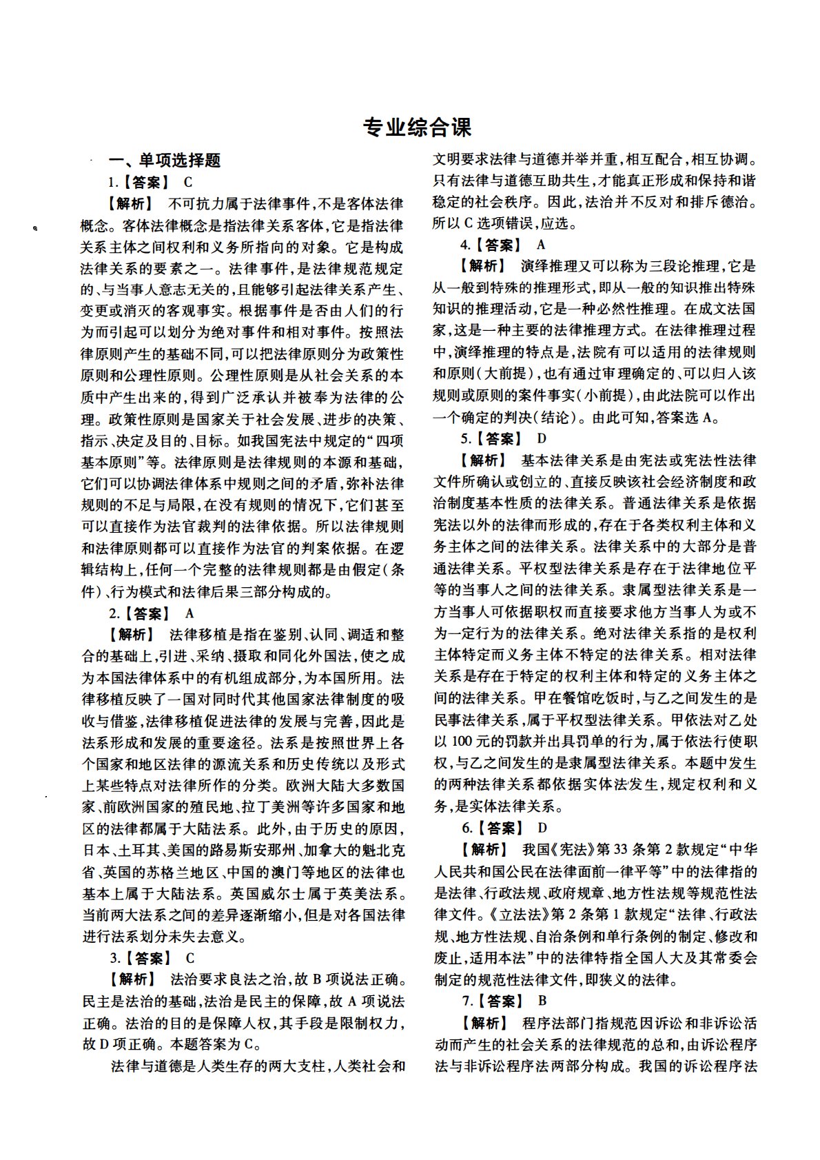 专业综合课.一、单项选择题1.[答案】C【解析】不可抗力属于法律事件,不是客体法律概念。客体法律概念是指法律关系客体,它是指法律关系主体之间权利和义务所指向的对象。它是构成法律关系的要素之一。法律事件,是法律规范规定的与当事人意志无关的,且能够引起法律关系产生、变更或消灭的客观事实。根据事件是否由人们的行为而引起可以划分为绝对事件和相对事件。按照法律原则产生的基础不同,可以把法律原则分为政策性原则和公理性原则。公理性原则是从社会关系的本质中产生出来的,得到广泛承认并被奉为法律的公理。政策性原则是国家关于社会发展、进步的决策、指示、决定及目的、目标。如我国宪法中规定的“四项基本原则”等。法律原则...