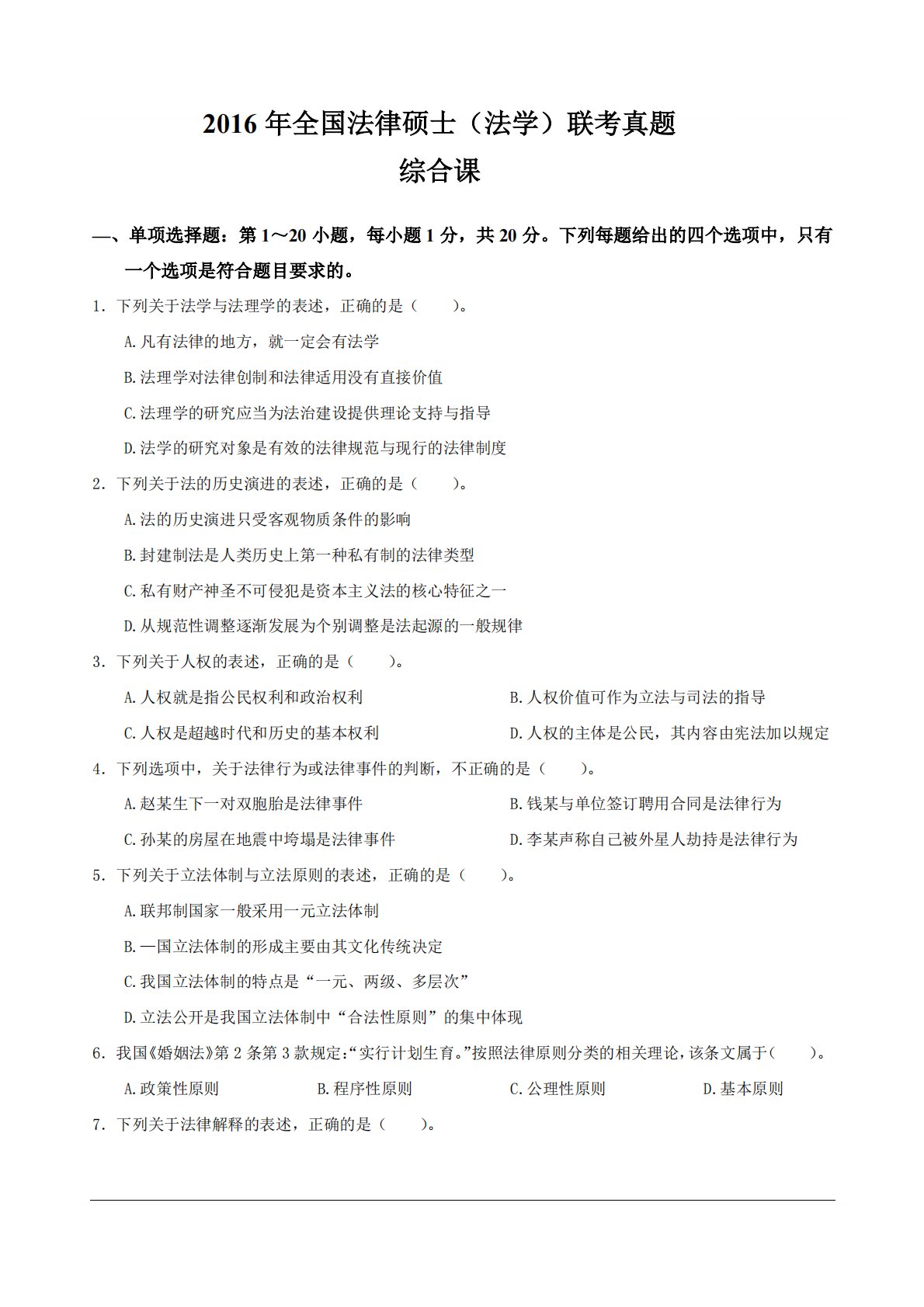 497法律硕士综合(法学)2016年考研初试真题