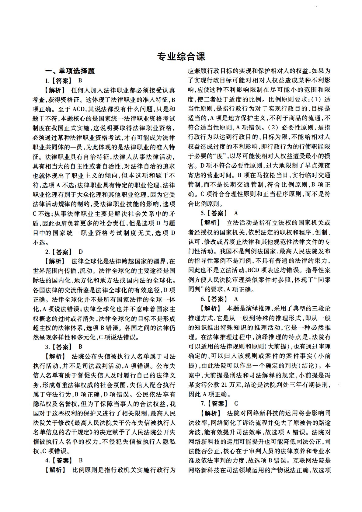专业综合课一、单项选择题1.(答案lB(解析】任何人加人法律职业都必须接受认真考查,获得资格证。这体现了法律职业的准入特征,B项正确。至于ACD,其说法都没有什么问题,只是和题干不符,本题核心的是国家统一法律职业资格考试制度在我国正式实施,这说明要取得法律职业资格,必须通过某种法律职业资格考试,才有可能成为法律职业共同体的一员,为此体现的是法律职业的准入特征。法律职业具有自治特征,法律人从事法律活动,具有相当大的自主性或者自治性,对法律自治的追求也就体现出了职业主义的倾向,但本选项和题干不符,选项A不选;法律职业具有特定的职业伦理,法律职业伦理有别于大众伦理和其他职业伦理,因为它受法律活动规律...