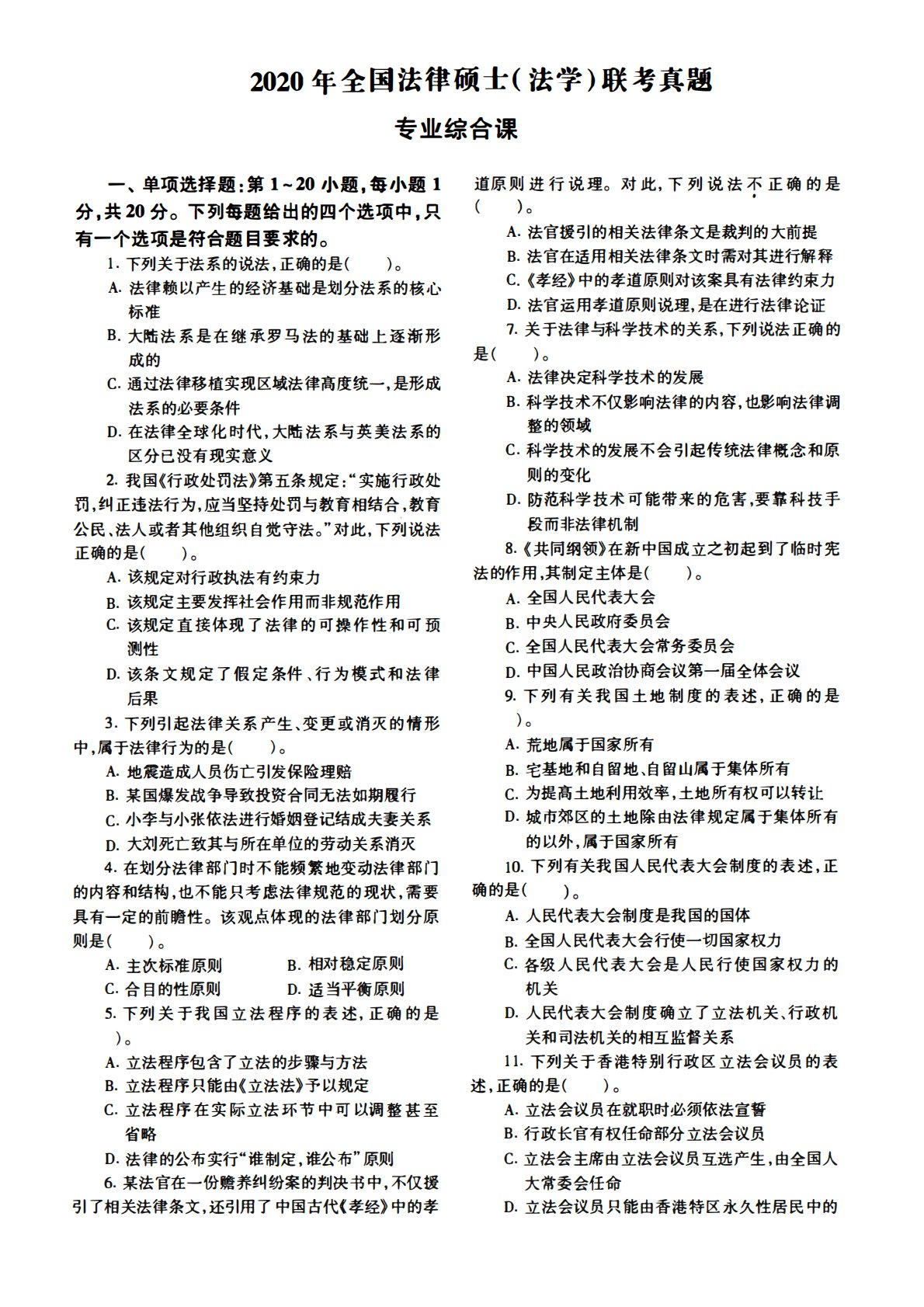 2020年全国法律硕士(法学)联考真题专业综合课一、单项选择题:第1~20小题,每小题1分,共20分。下列每题给出的四个选项中,只有一个选项是符合题目要求的。1.下列关于法系的说法,正确的是()。A.法律赖以产生的经济基础是划分法系的核心标准B.大陆法系是在继承罗马法的基础上逐渐形成的c.通过法律移植实现区域法律高度统一,是形成法系的必要条件D.在法律全球化时代,大陆法系与英美法系的区分已没有现实意义2.我国《行政处罚法》第五条规定:“实施行政处罚,纠正违法行为,应当坚持处罚与教育相结合,教育公民法人或者其他组织自觉守法。”对此,下列说法正确的是()。A.该规定对行政执法有约束力B.该规定主要...