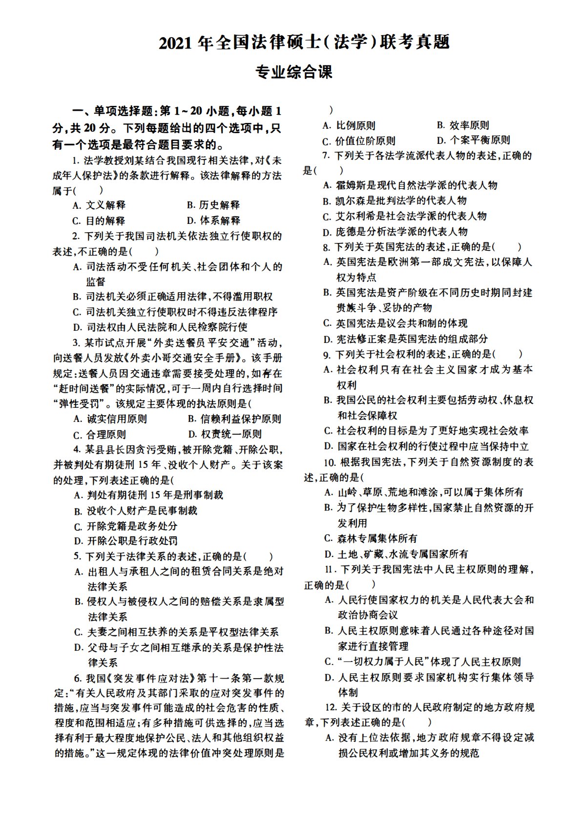 2021年全国法律硕士(法学)联考真题专业综合课一、单项选择题:第1-20小题,每小题1分,共20分。下列每题给出的四个选项中,只有一个选项是最符合题目要求的。1.法学教授刘某结合我国现行相关法律,对《未成年人保护法》的条款进行解释。该法律解释的方法属于()A.文义解释B.历史解释C.目的解释D.体系解释2.下列关于我国司法机关依法独立行使职权的表述,不正确的是()A.司法活动不受任何机关、社会团体和个人的监督B.司法机关必须正确适用法律,不得滥用职权C.司法机关独立行使职权时不得违反法律程序D.司法权由人民法院和人民检察院行使3.某市试点开展”外卖送餐员平安交通”活动,向送餐人员发放《外卖小...